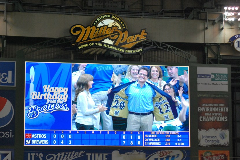 The Brewers led 7-0 after the 3rd and between innings the scoreboard displayed a Happy Birthday message to Brewers owner Mark Attanasio. His seats are right next to the Brewers dugout and he got some face time. He showed off a 2011 sport coat last year during the playoffs last year. In a word: Awesome.