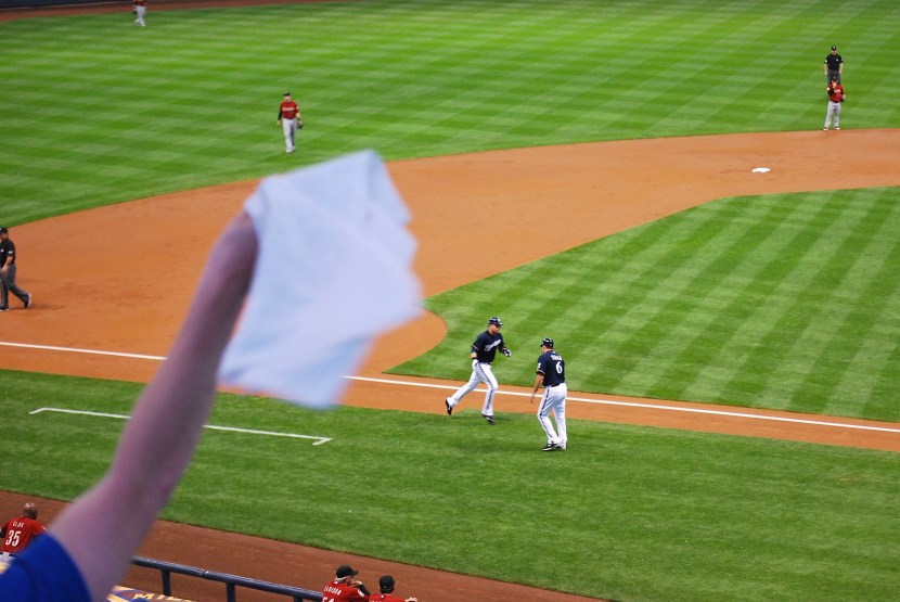 In the bottom of the 3rd Corey Hart got his second at bat in as many innings and he didn’t disappoint. His three-run home run in the 3rd gave him two home runs and 4 RBI in a span of 26 minutes; very impressive. Second time didn’t work out so well with the towels:
