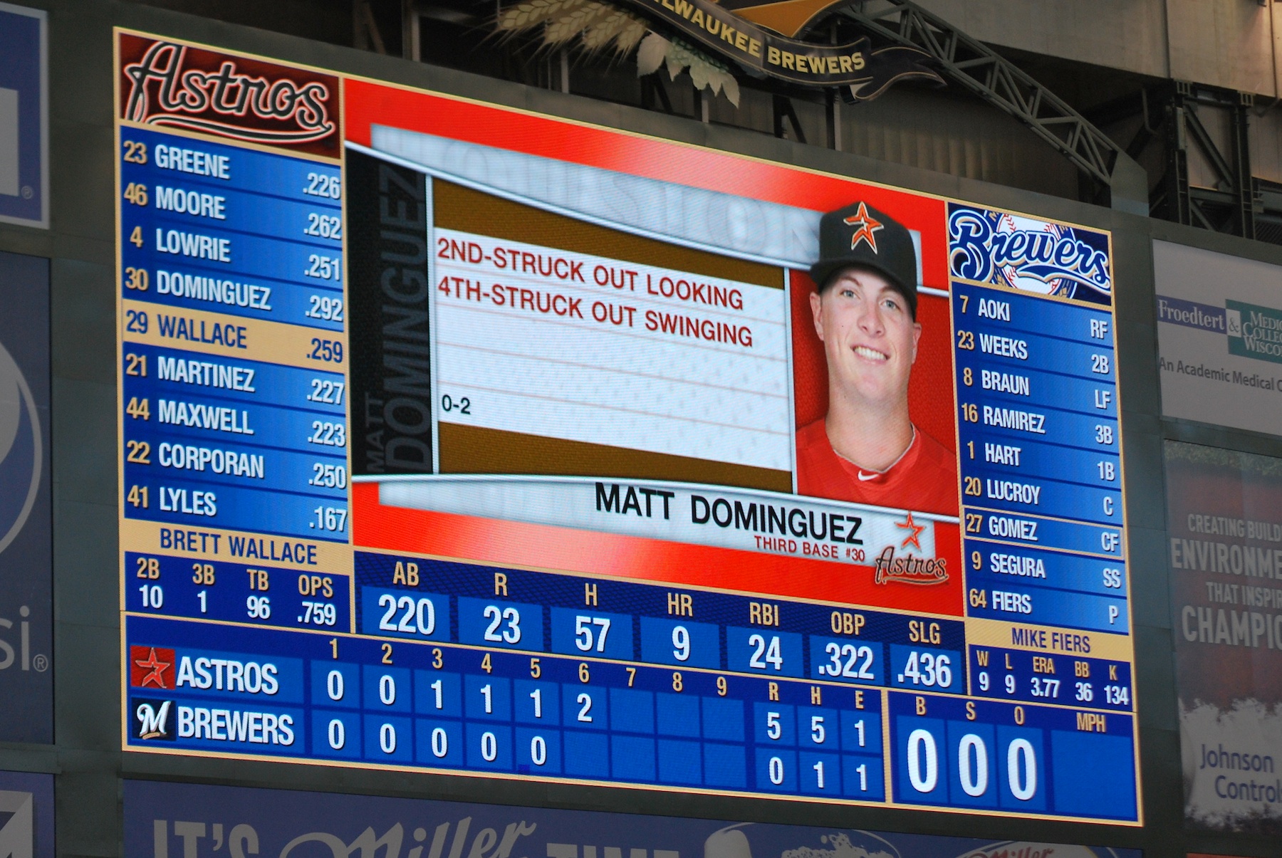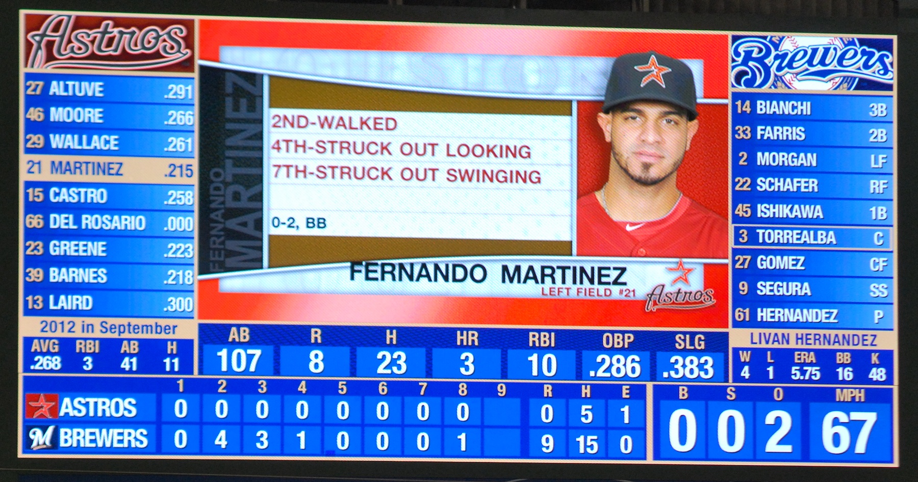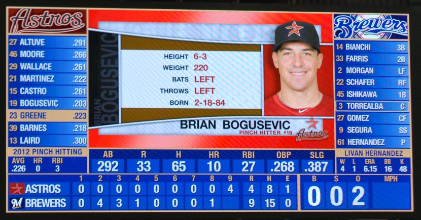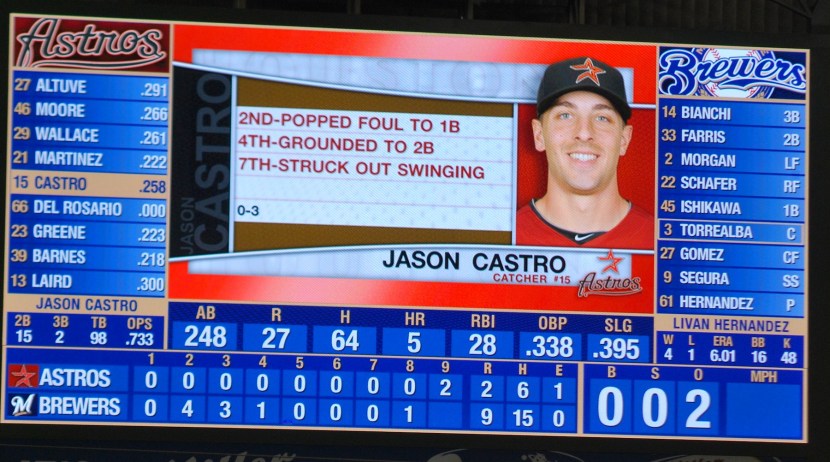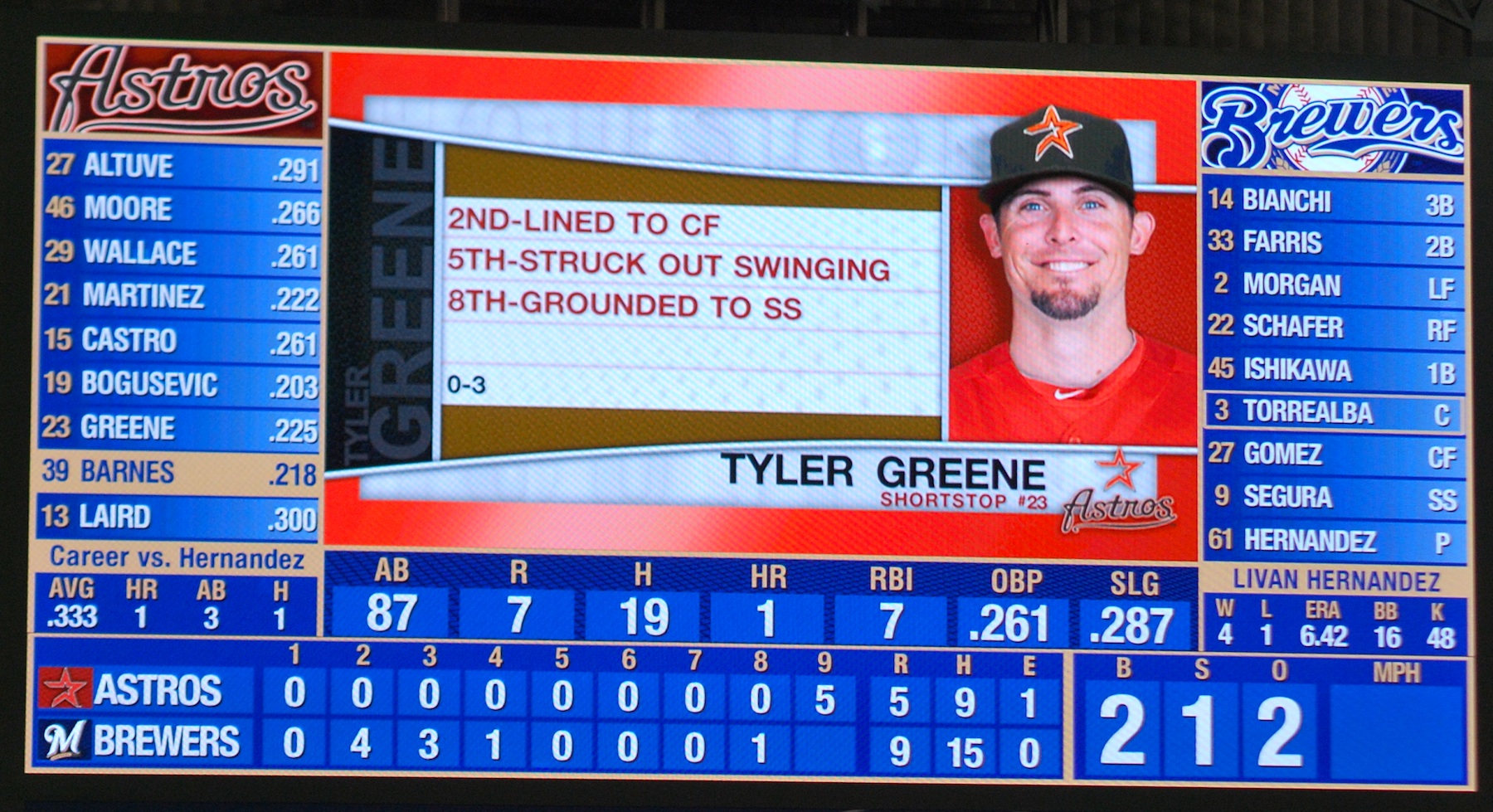 The Brewers added solo runs in the 4th and the 8th. In the top of the 9th I took a picture of the scoreboard after there were two outs hoping it would represent the final linescore. Note the zero runs for the Astros: