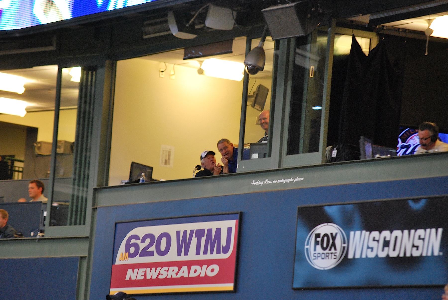 I think it was in the 8th or 9th inning when a foul ball came back into section 221 and deflected off some hands and hit a guy in the face. Police and medics came by and he was holding his nose for the rest of the game. I looked back at the 620 WTMJ booth and saw Uecker and someone else pointing out towards the injured fan. It looks like they were laughing but I’m not going to judge (they could’ve been talking about something else). It just so happens that Adam McCalvy made the picture (far left) and so did Bill Schroeder (far right). Yay!