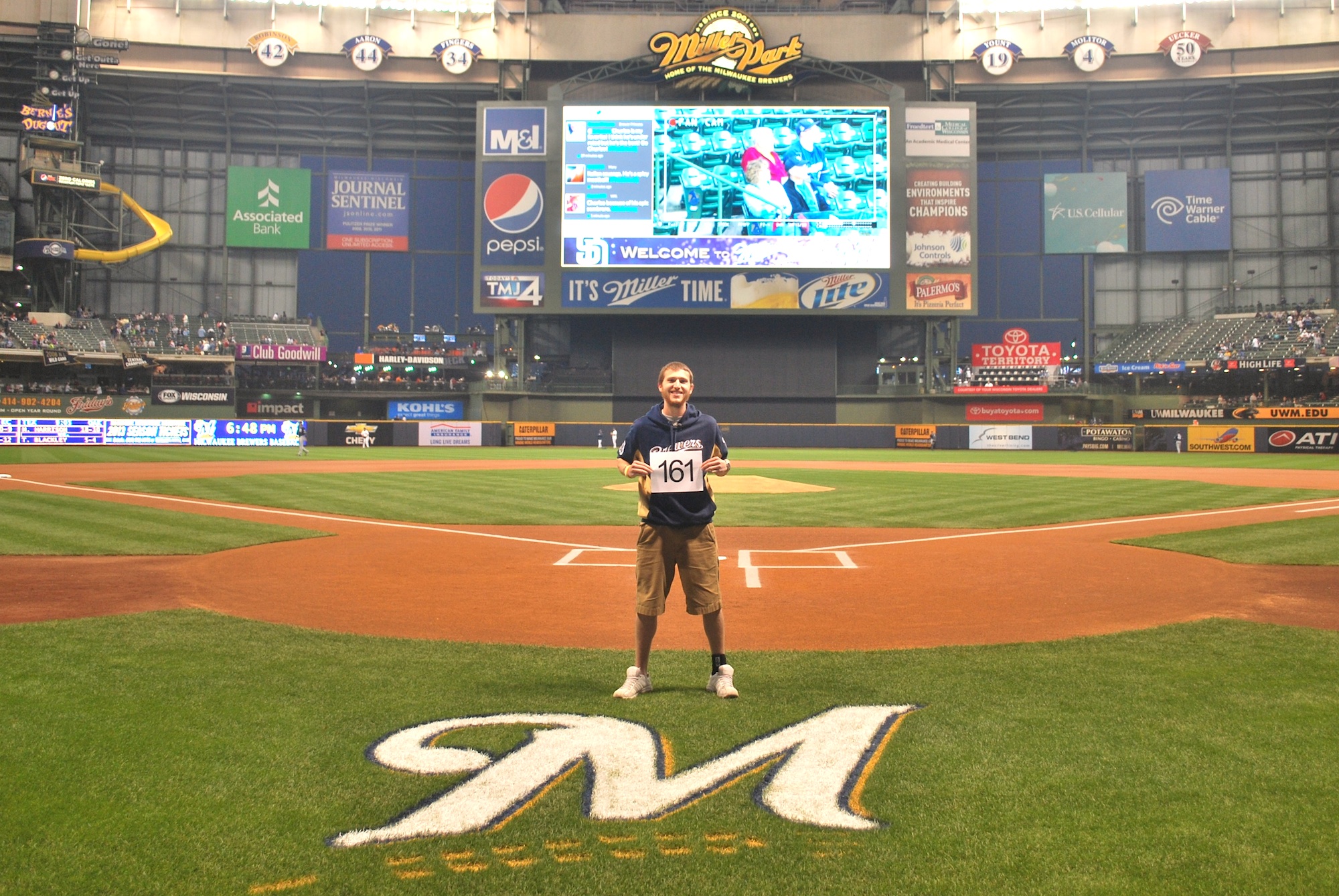 Outside of Miller Park I met with Jason Newton and his cameraman, Hank. Jason is a reporter for WISN Channel 12 out of Milwaukee and he had asked to do a feature on me. Hank mic’d me up and I answered a few questions once I got inside the home plate entrance. Victoria and I met up with Kathy Schwab, and she led us down to the field. Game photo number 161: