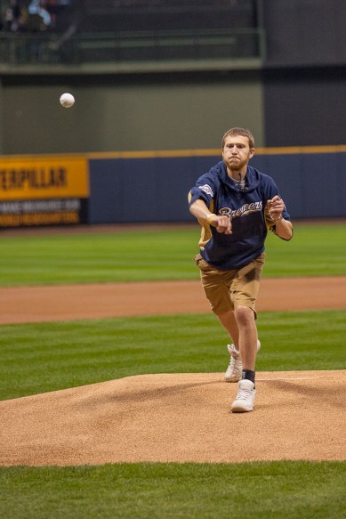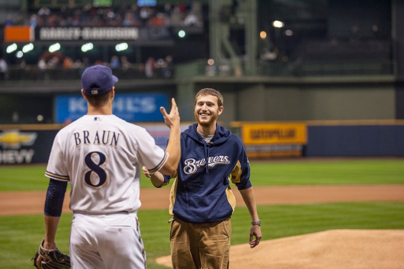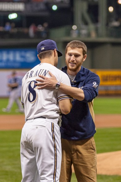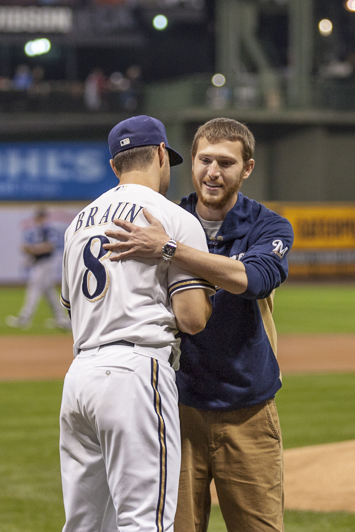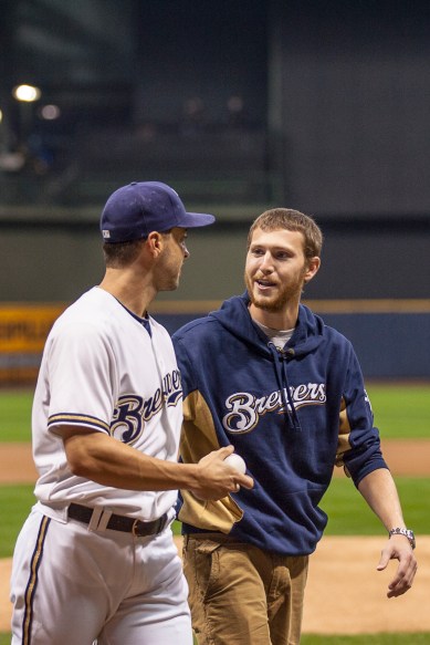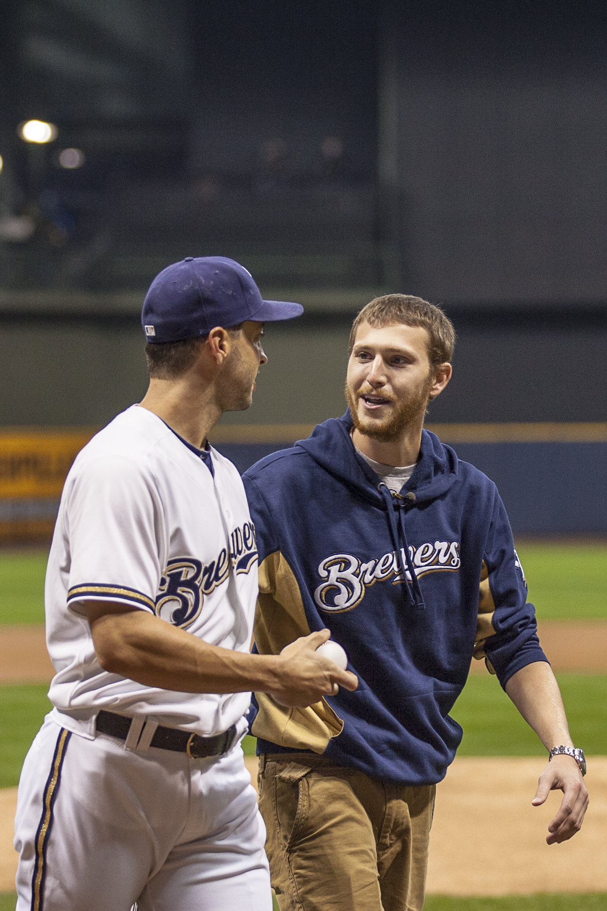 Tuesday was the second-to-last game of the year, and it was a special one. Victoria and I left Madison at 3:30 and made it to Miller Park about 90 minutes later. I met up with a friend, Josh, to play catch for a few minutes before heading inside for my first pitch. He was with a group from Fort Atkinson, and they surprised me with a $550 check for Be The Match. Thanks guys!! I probably made about 30-40 throws with Josh (bouncing one). They were kind of all over the place so I wasn’t feeling too confident about my ceremonial first pitch.