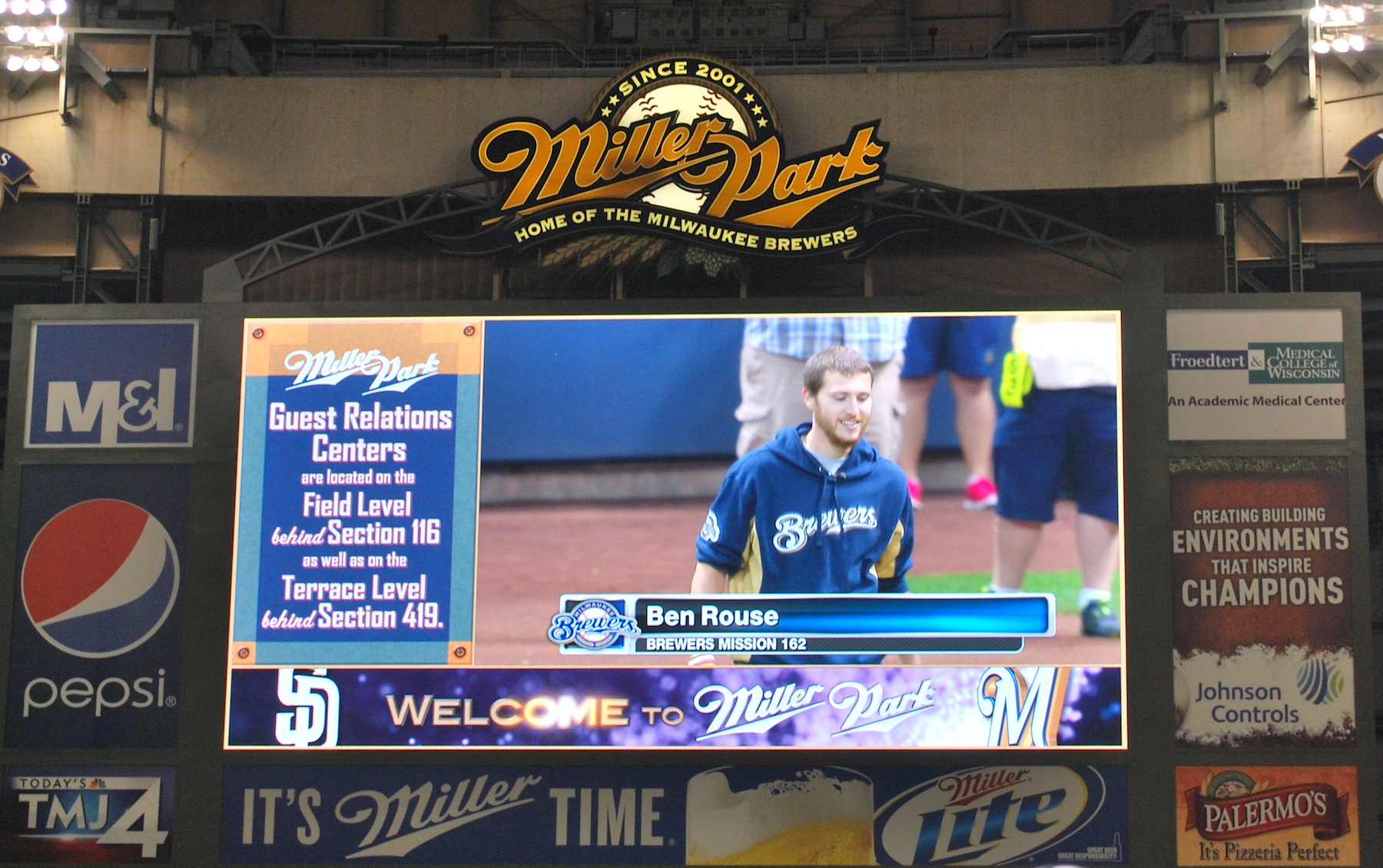 After the interview we returned to our seats, stopping to get a Polish sausage along the way, my 99th sausage since Opening Day. The Padres scored a run in the top of the 4th, added another in the 6th inning and still had the bases loaded with only one out. Kameron Loe came in to try and escape the jam and allowed only one inherited runner to touch home plate. Whew! Axford got the save opportunity in the 9th and struck out the first two batters he faced. The next two singled and the Padres had runners on the corners with two outs. Axford got the job done and induced a game ending groundout to Jean Segura at short and the Brewers held on. Final score: Brewers 4 – Padres 3.
