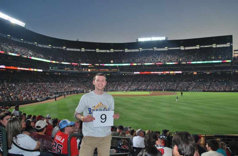 I got my game number 9 picture taken in 6th or 7th, and some people asked what it was all about. I actually stood up during two separate half innings because the first time Dave took the picture he didn’t stand up, and a lady who was sitting right in front of him, dominated the shot. A guy who I was standing in front of said “What’s the nine for? Are you commemorating the ninth anniversary of when you lost your virginity?” Hilarious. During the second attempt to get a good picture he got serious and asked what it was really for, and I’m guessing he kind of felt stupid after I told him, because then he started asking questions. After the game he spotted me when he was entering the concourse and shook my hand again and wished me good luck. Back to the picture: