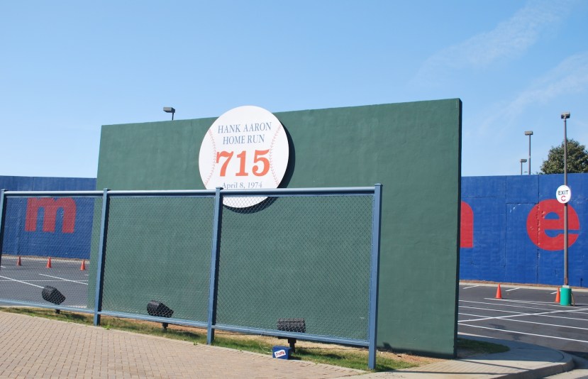 Hank Aaron hit the home run at the now demolished Atlanta Fulton County Stadium, which was torn down in August of 1997, the first year that the Braves called Turner Field home. They also have bricks laid out to represent where the infield was amongst the asphalt parking lot.