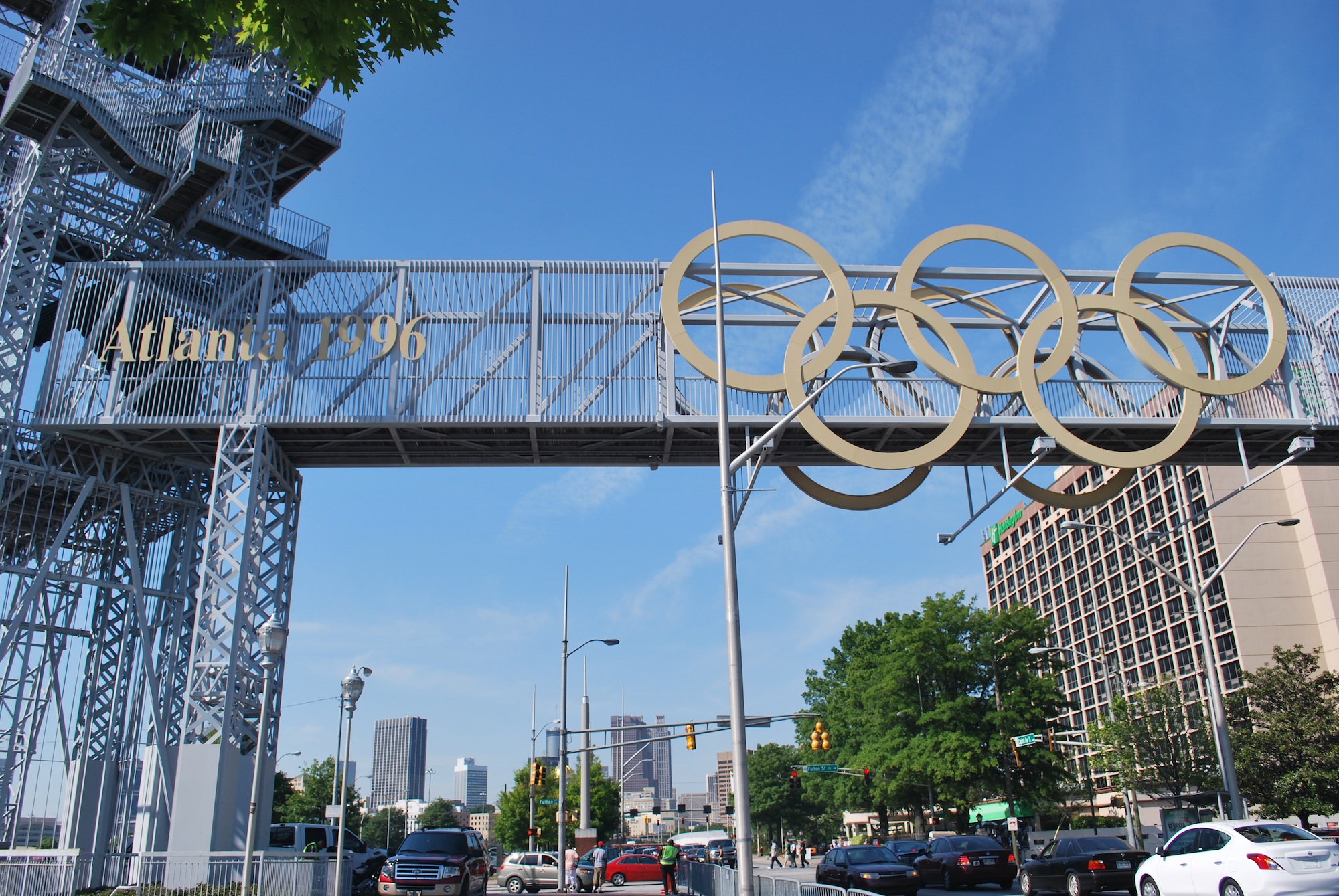 You can see more of the exterior of Atlanta Fulton County Stadium that I alluded to yesterday (the blue wall with red lettering). You can also see the commemorative Olympic torch on the right, with the Olympic emblem to the right of that.