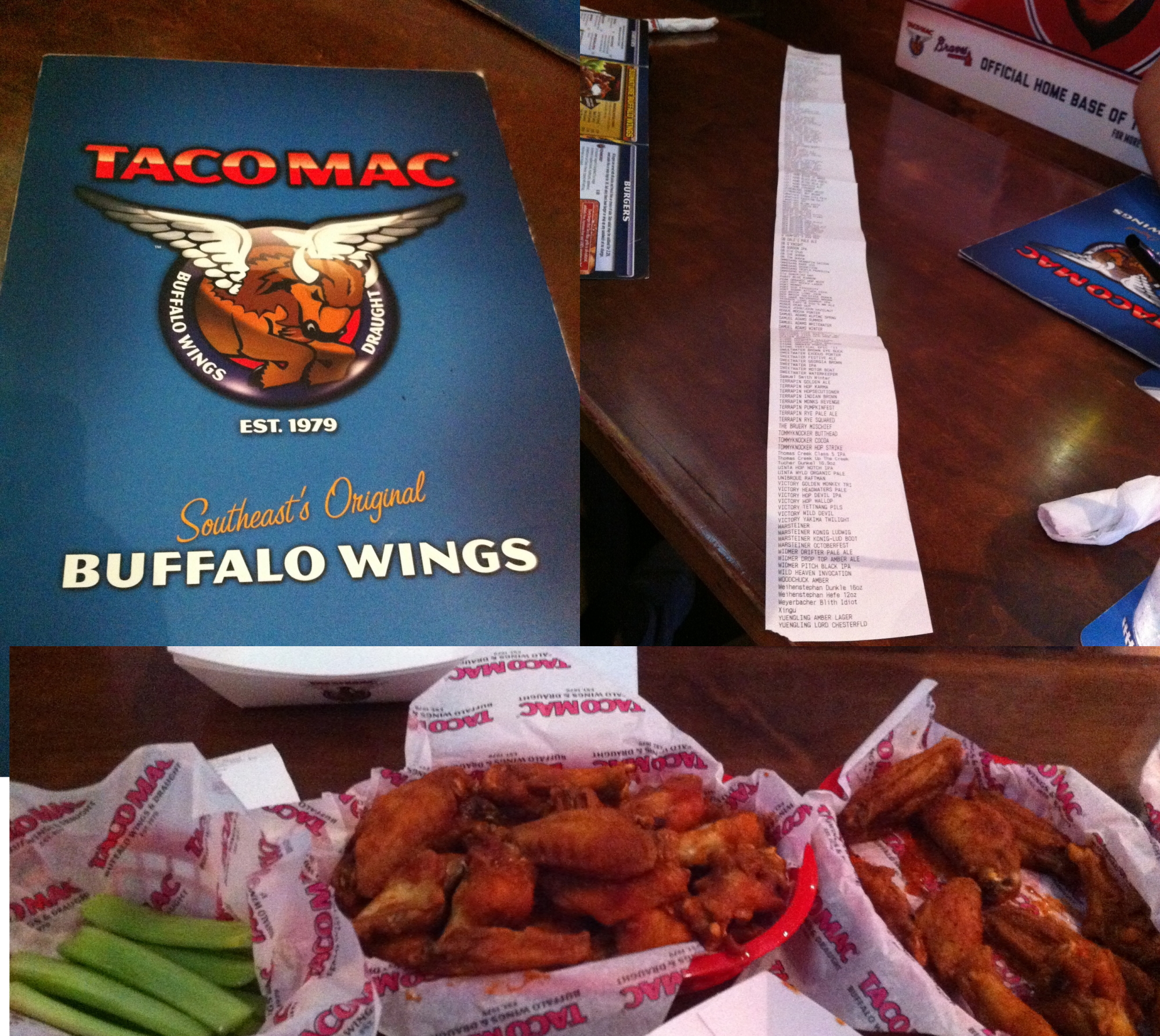 I woke up at 8:30 on Saturday and started working on the blog for Friday’s game at 9:00. At 11:15 Dave came into the basement and said we were getting kicked out because Annette’s fraternity (it’s co-ed) was doing an initiation at the house. I quickly got ready and Dave and I drove to the Taco Mac nearest to his house. Dave and Bill love Taco Mac (see the 4-13 post if you don’t know who Dave and Bill are). Taco Mac sounds like it would be a Mexican place, with maybe a little bit of macaroni thrown in there. Nope, wings are their specialty. I read their website and the reason behind it makes sense. Long story short; two guys had opened up a wing shop back in the late seventies, and their first place was an old taco stand. The name stuck and they’ve opened up a bunch of locations since then. Below is a picture of the front of the menu on the left, a picture of Dave’s Brewniversity progress receipt, and the wings we ordered.