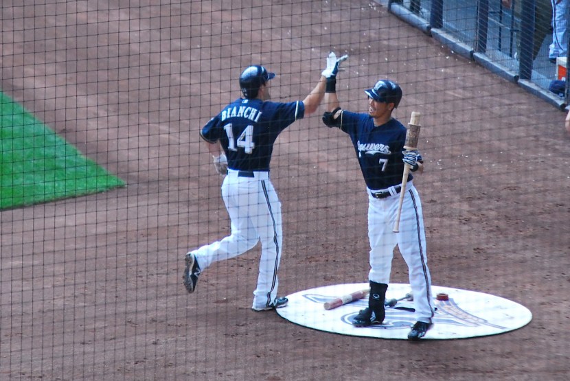 A leadoff home run in the top of the 2nd cut the Brewers’ lead to 3-2. In the bottom half the Brewers answered when Jeff Bianchi hit his second home run of the season. I love how happy Aoki appears to be while giving a high five to Bianchi.