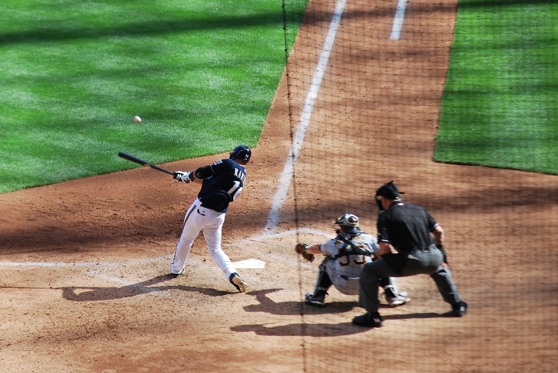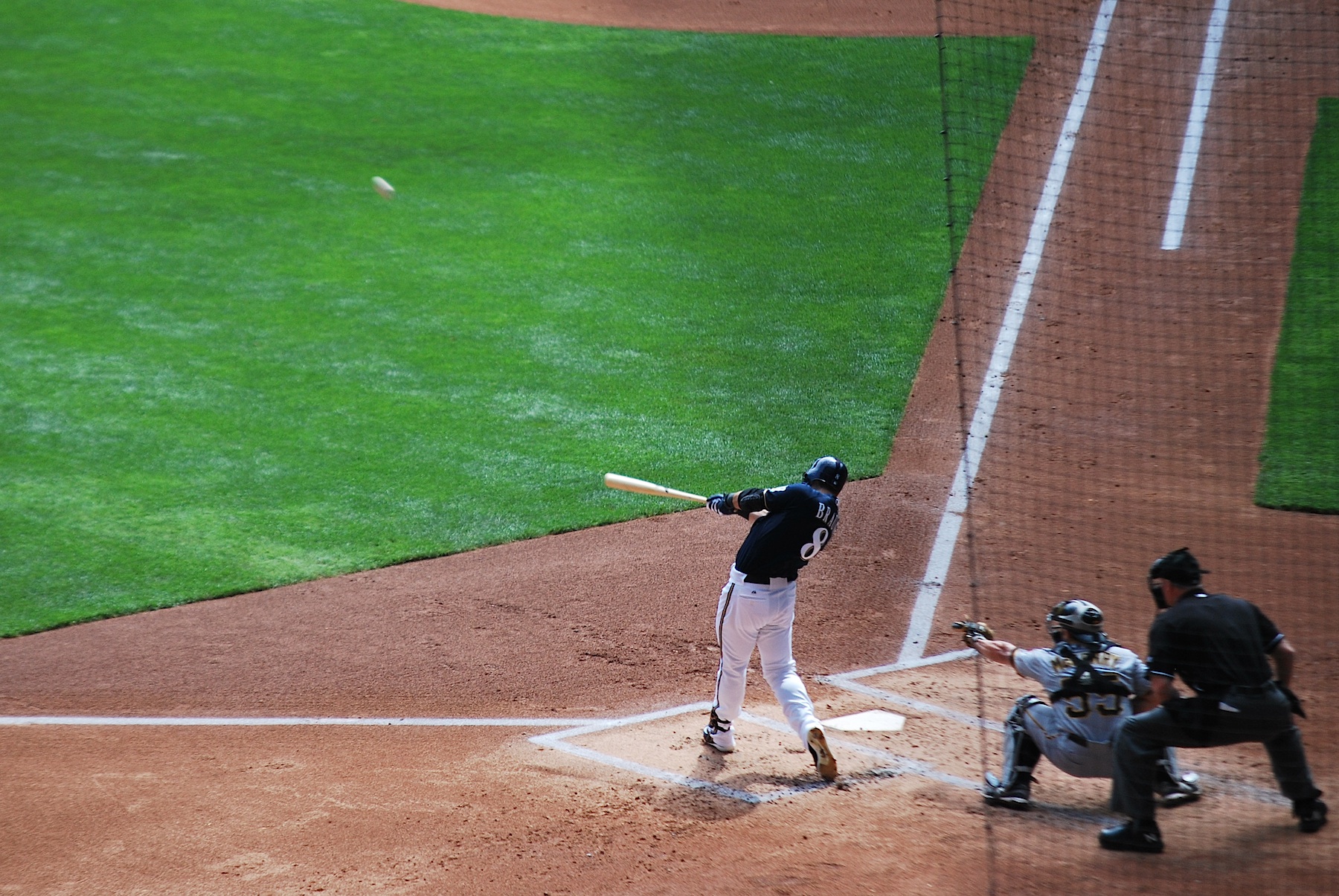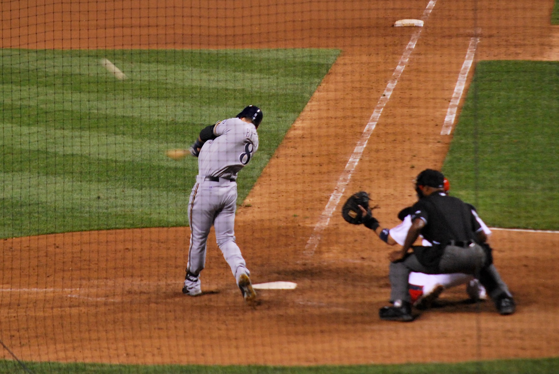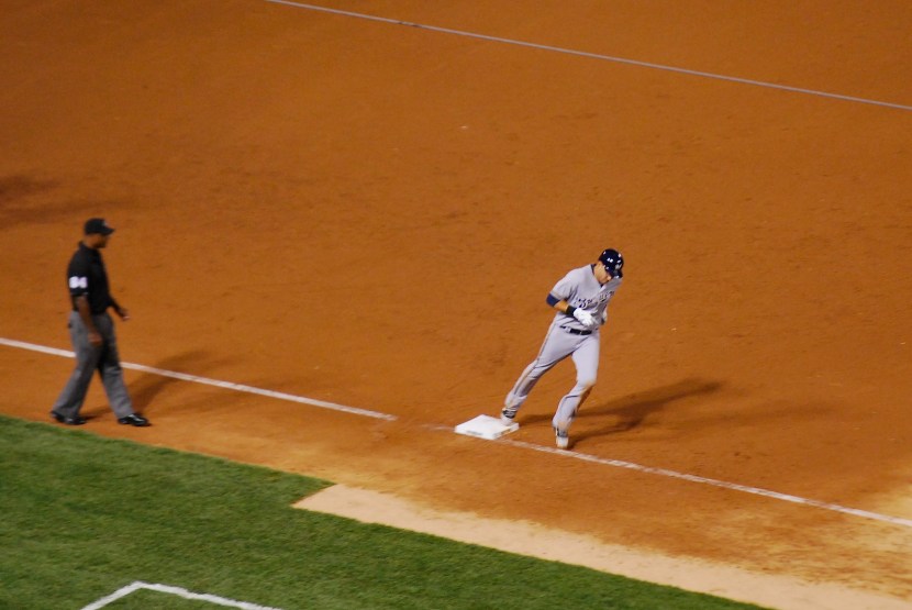 If you look closely at the picture above (you might have to click on it) you can see the ball in foul territory above Braun’s left (front) foot. It had a bunch of spin on it though and it rolled in the grass down the third base line for the go-ahead RBI. In the boxscore it’s the same as a line drive base hit.