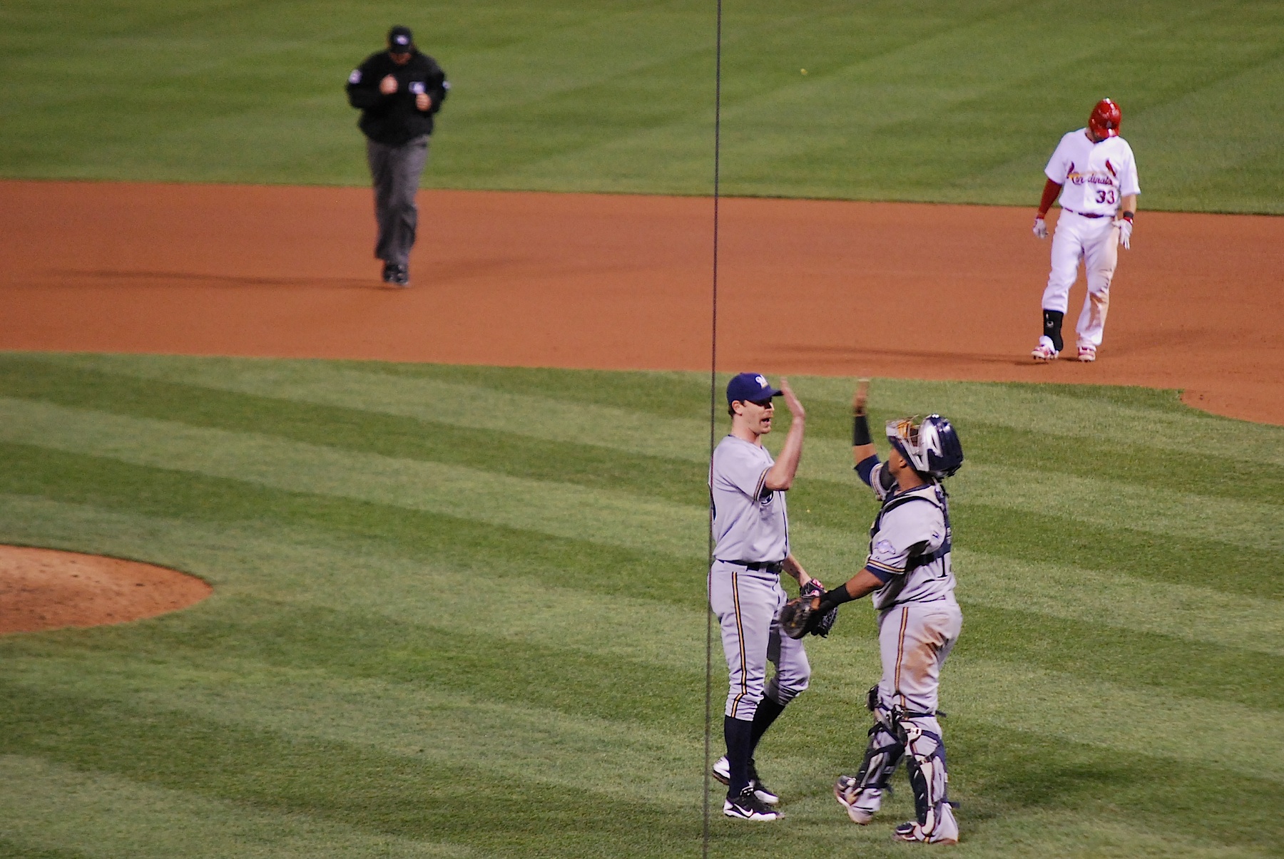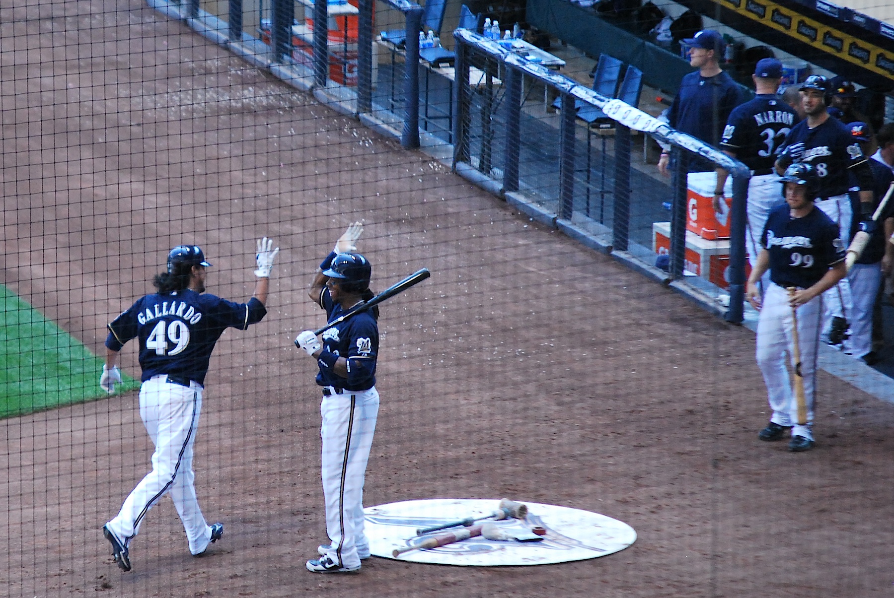 In the top of the 7th inning Rickie Weeks hit a solo home run to lead off the frame. Here he is heading back to the dugout after giving the Crew a 4-1 lead.