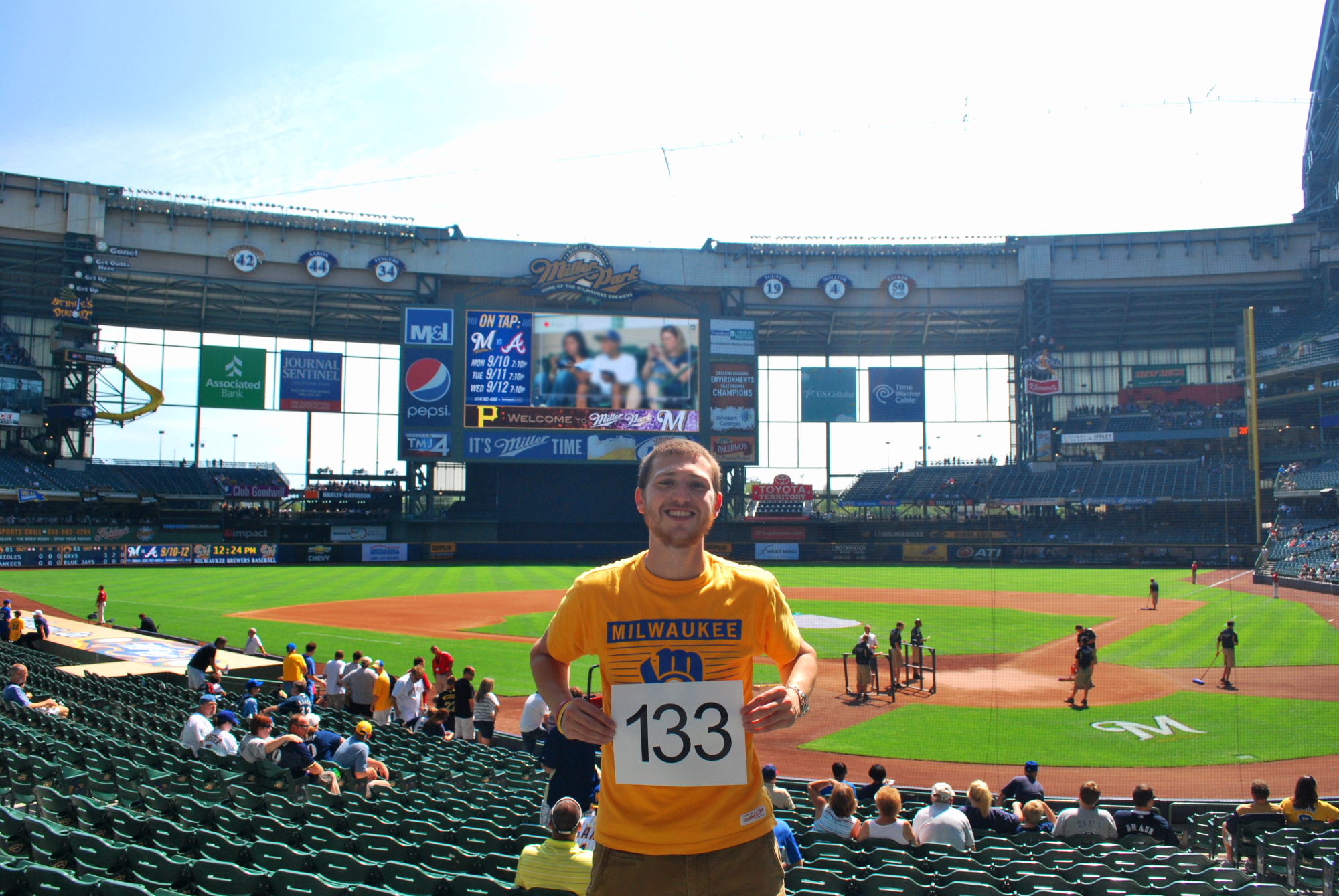 Joel was my twitter follower who joined me at Monday’s game, and this was his first trip to Miller Park since opening day. He had been in Connecticut for an internship but was now back in Milwaukee to finish up school. Joel was waiting in our seats by the time I got there at 6:55. He made a $40 donation to Be The Match for his ticket. Thanks Joel!