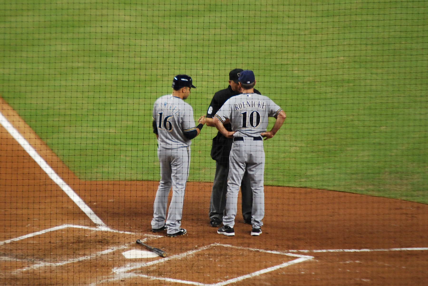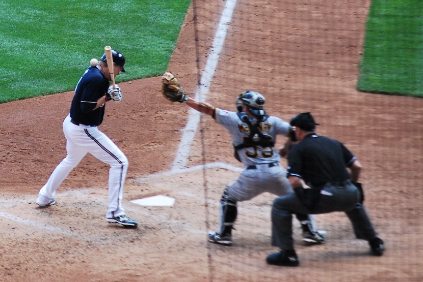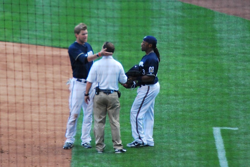 The 91 mile per hour fastball hit Hart at the bottom of his batting helmet. He was a little shaken up but ran down to first and stayed in the game. If it would’ve been just a little bit lower there could have been some serious problems, and a lot more pain. Maldonado grounded into an inning ending double play and the trainer came back out to make sure Hart was still OK. I’m assuming Hart is telling the trainer where he got hit. Either that or he’s giving the trainer an between innings neck massage as Rickie Weeks watches.