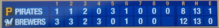 Final Score: Brewers 11 – Pirates 7. This was the linescore after it was all said and done. 10 of the first 12 half innings saw runs being scored. Crazy stuff.