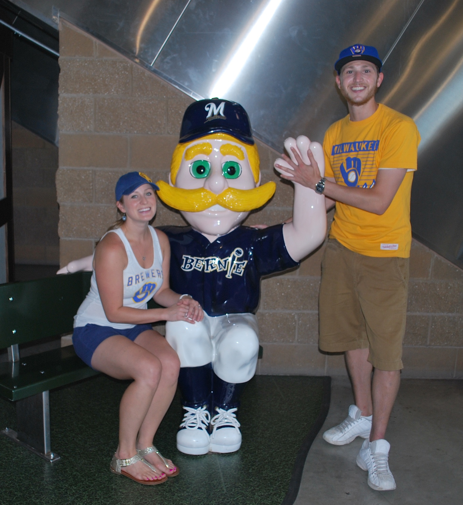 We headed to the escalator in the left field corner and came across Bernie’s Chalet and Bernie himself. I’m giving him a corny high five even though he’s actually waving.
