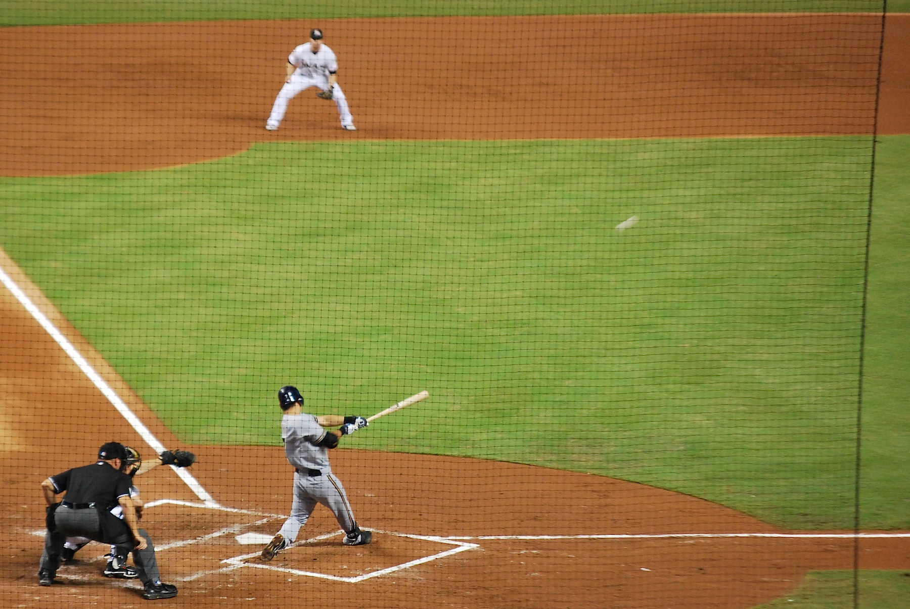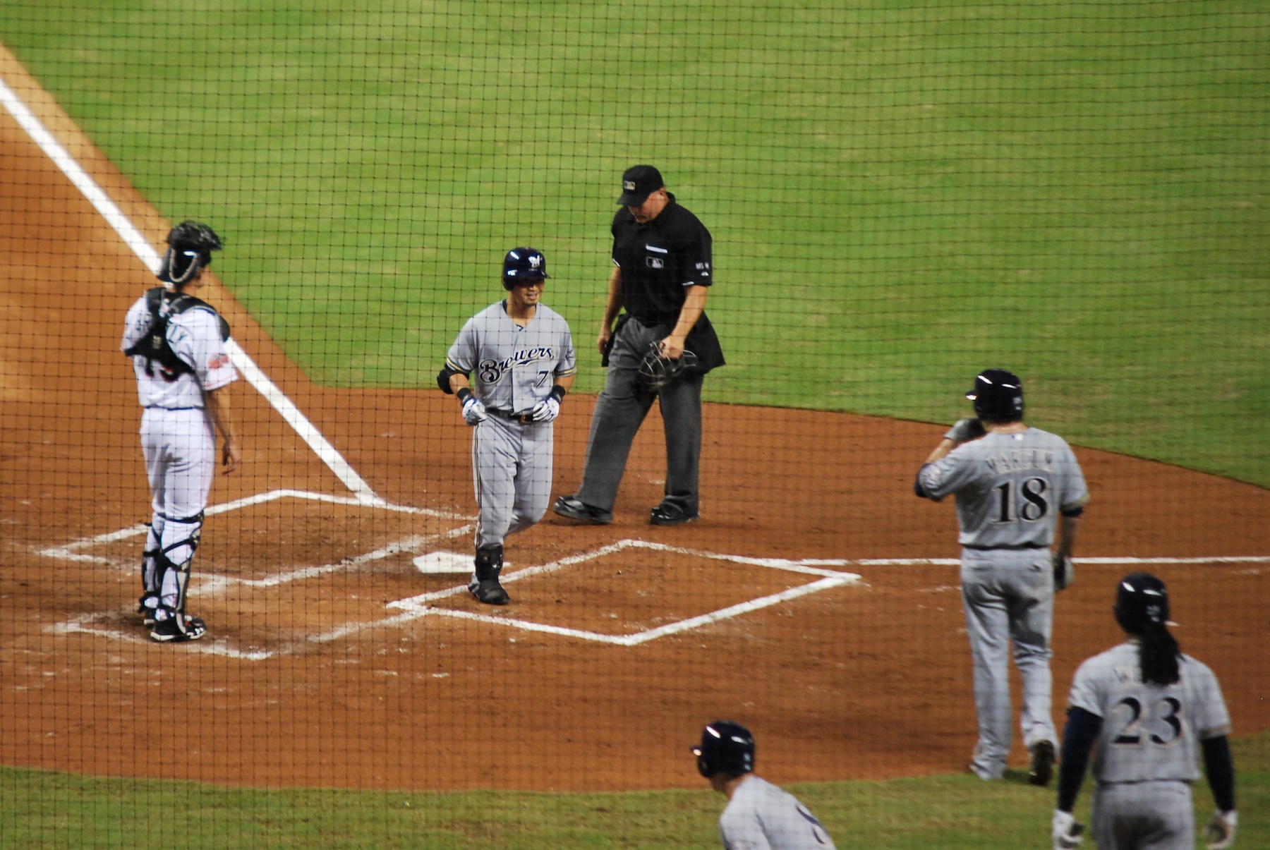 In the 5th I got to see it in action again when Gorkys Hernandez hit his first major league home, a 2-run shot that gave the Marlins a 4-3 lead. The Brewers tied the game at four when Aoki drove in Nyjer Morgan with a 7th inning double. After Rickie Weeks reached first on an infield single Braun came to the plate with runners on first and third, trying to give the Brewers the lead. He swung at the first pitch and sent a dribbler towards third: