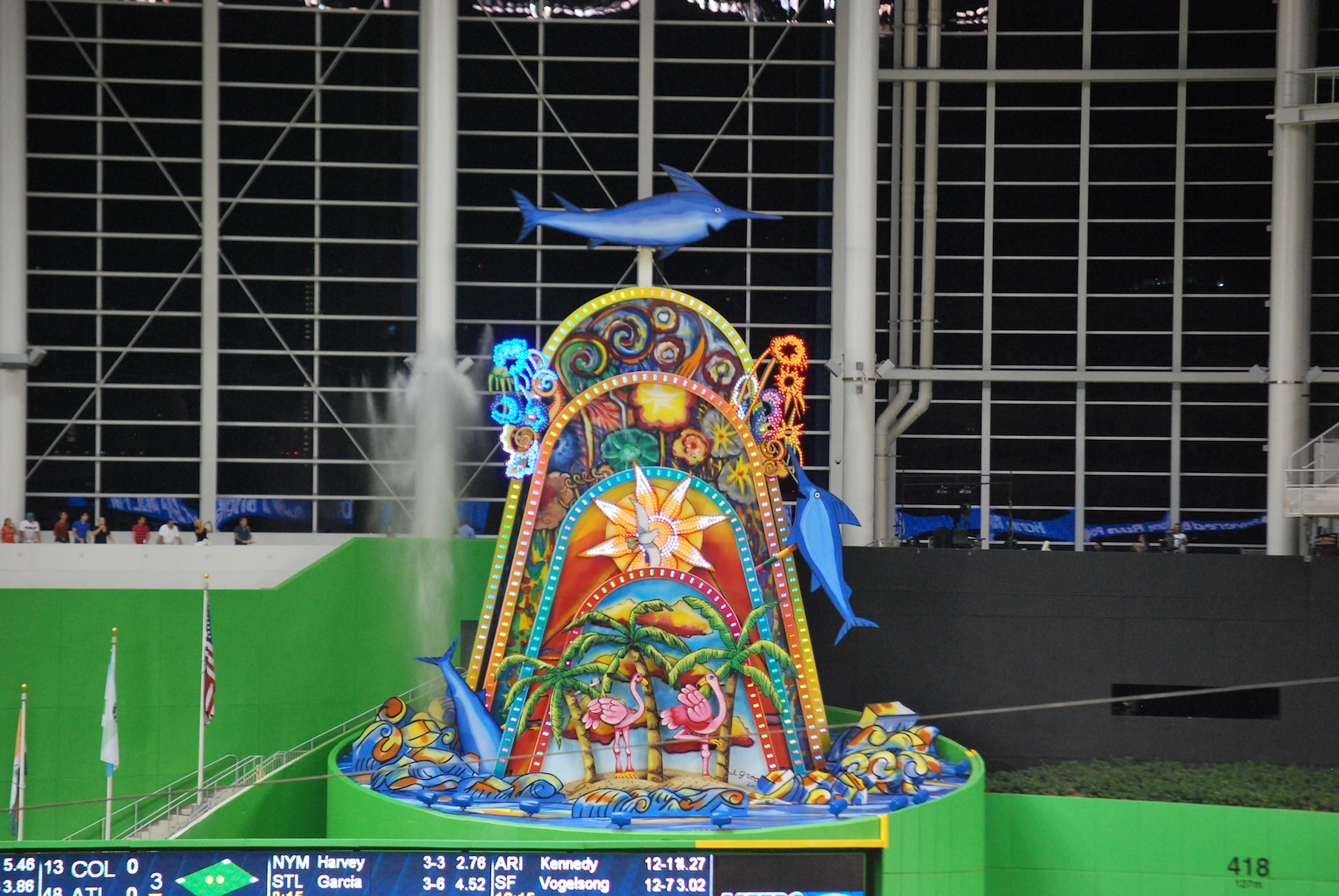 In the 4th Giancarlo Stanton (who is a man-child at the age of 22) hit a bomb over the wall in center. The centerfield wall is 418 feet away so it was hit extremely well. The home run cut the deficit to one but more importantly I got to see the home run sculpture do its thing. It lights up, the Marlins go around on a track and water shoots up from the side.