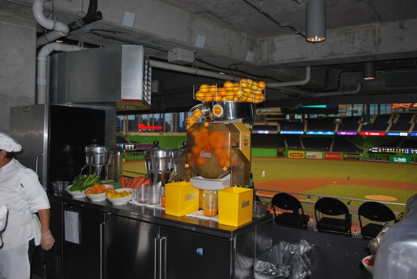 I walked to the left field corner where they have a Taste of Miami area with local fare. I had the pork sandwich and while it was only $7 it wasn’t spectacular by any means. I think I’ll try the Cuban sandwich during one of the other games. Not pictured is the Reyes of Sunshine smoothie I got. The Marlins have a player by the name of Jose Reyes, thus the strange spelling. It consisted of strawberries, bananas, mangos, coconut milk and agave nectar. That was also $7 but I think it was worth it.