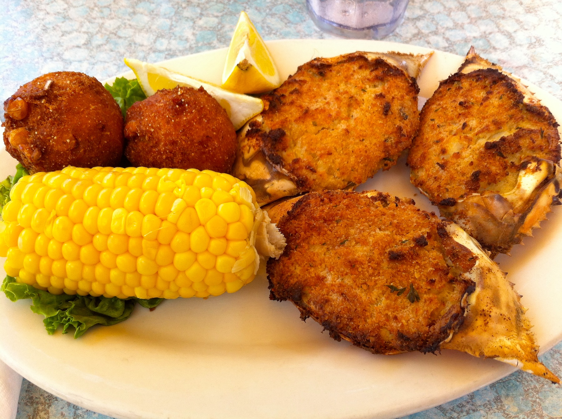 At about 1:45 I went to CJ’s Crab Shack for lunch. I got the Crab Cake Dinner, and it was good. They add 18% gratuity no matter how big your party is and my total came to $34.23. Expensive but every place on Ocean Drive is expensive. At CJ’s they take the meat out of the crab, do whatever it is they do and then put the mixture back into the shell and cook it. I chose corn on the cob and hush puppies as my side.