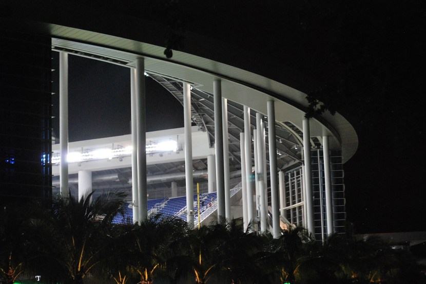 My Monday actually started on Sunday night. After getting back to my parents’ place I wrote the post for Sunday and packed for the seven game road trip. I left the house at 10:56 PM, stopped for gas in Janesville, and then drove four and a half hours until I reached St. Louis. I had made good time so I filled up before I went to the airport, which will make it easier once I get back from Miami. I parked in the $7 surface lot and was inside the airport by 4:40 AM. My flight took off at 6:36 and I was able to get about an hour of sleep. As we were over Miami I (barely) got a picture of Sun Life Stadium, which the Marlins called home from 1993 to 2011. It opened in 1987 and the Dolphins (NFL) have played there ever since. It’s just above the plane’s engine if you couldn’t see it.