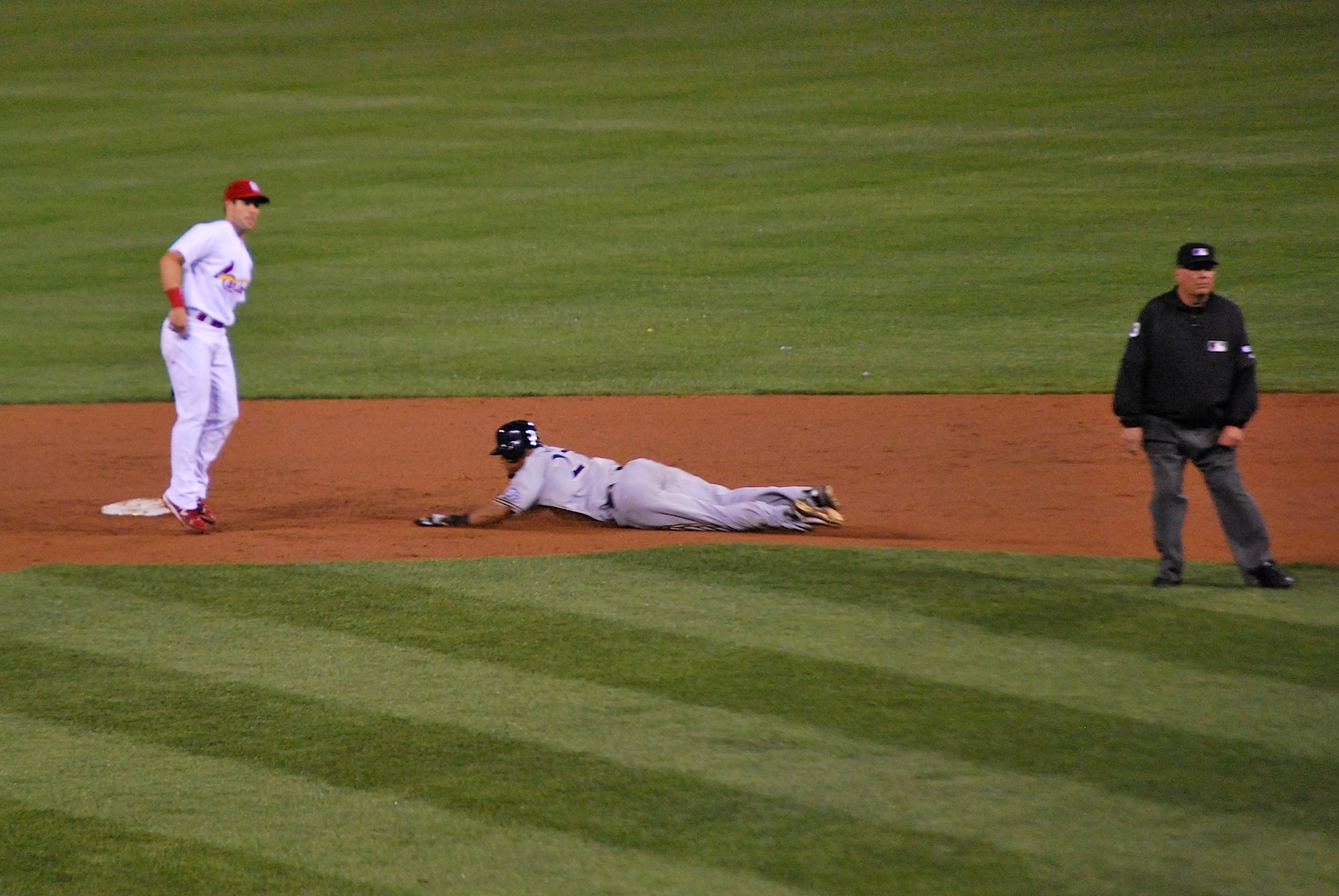 Taylor Green singled home Lucroy to give the Brewers a 3-0 lead. Aoki came through in the clutch once again and doubled to right. Here he is sliding into 2nd. You can see Ed Sedar (the third base coach) pointing to third to make sure Taylor Green stays put.