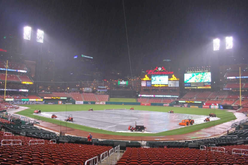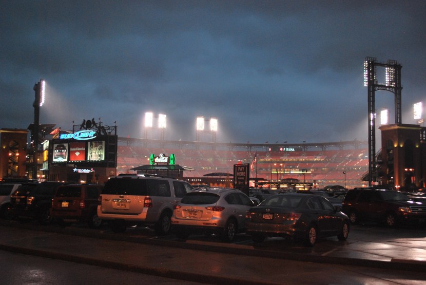 The rain slowed (somewhat) and I left at about 6:50 for the 7:15 first pitch. As I neared Busch Stadium this was the scene: