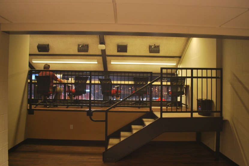 Adam McCalvy, the Brewers beat writer, had given me his flip cam to get some footage of my travels and experiences during the Miami series. Adam wasn’t in Miami but we had agreed that I would give it back to him in St. Louis. I went up to the upper deck, where the writer’s press box is located, and talked with him for 15 minutes or so. This is just inside the door to the press box on the fourth level of the stadium: