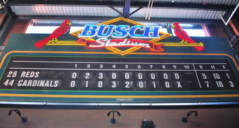 I got to the will call windows at 4:45 and was inside the park shortly thereafter. I don’t remember if I had included an image of the old scoreboard from Busch Memorial Stadium in an earlier St. Louis post but here’s another one anyways. Busch Memorial Stadium, commonly called Busch Stadium, or Busch Stadium II, was home to the Cardinals from 1966 to 2005.