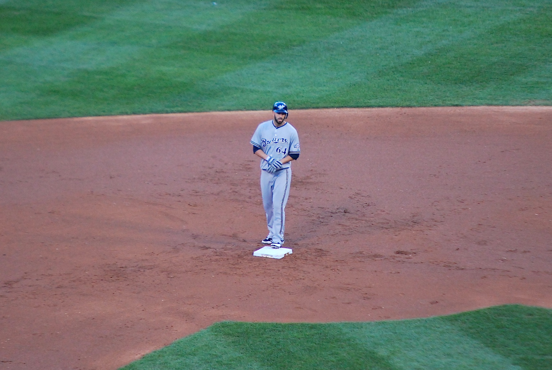 In the top of the 2nd the Brewers struck first, taking a 1-0 lead on a bunt by Carlos Gomez that drove in Aramis Ramirez. Westbrook appeared to pitch around Bianchi and issued a four pitch walk. I was telling the guy next to me that he likely pitched around Bianchi because Fiers was not very good at the plate. Coming into the game Fiers was 1 for 25 with 15 strikeouts, and the one hit was a bunt single. Fiers quickly went down 0-2 in the count but he got a pitch to hit with the two strike offering and grounded a base hit up the middle that reached the outfield grass. Lucroy scored and Bianchi wound up at 3rd, and Fiers 2nd. Here’s Fiers after getting his first major league RBI. Nice job, Mike!