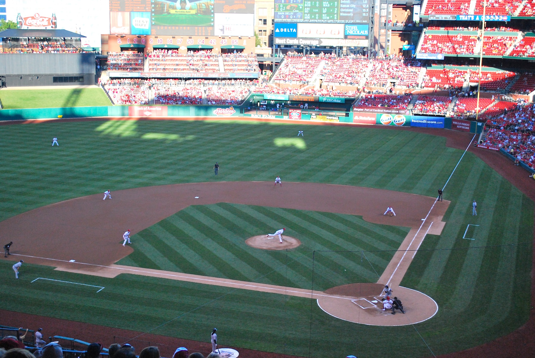 I got to my seat in section 253 and got situated for the game. Jake Westbrook was on the hill for the Cardinals and he got the game started by throwing a first pitch ball to Aoki.