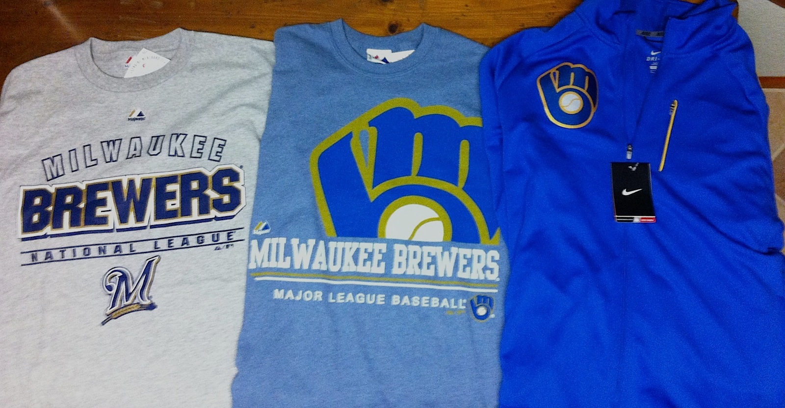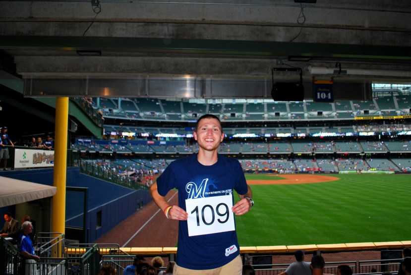 After thanking the kid and his family for taking the picture for me I went over to the team store to pick up some merchandise that the Brewers provided. It’s always tough getting the right size for me because sometimes I’m a medium, sometimes I’m a large, and sometimes I’m even an extra large. Manufacturers need to get their shizzy together and standardize things. It doesn’t help my cause that I have goony arms; I’m six feet tall but have a 6 foot 4 wingspan. I met up with Nathan and he handed over two shirts and and a zip up track jacket. I can’t thank the Brewers enough for helping me out and providing me licensed apparel to wear to the games.