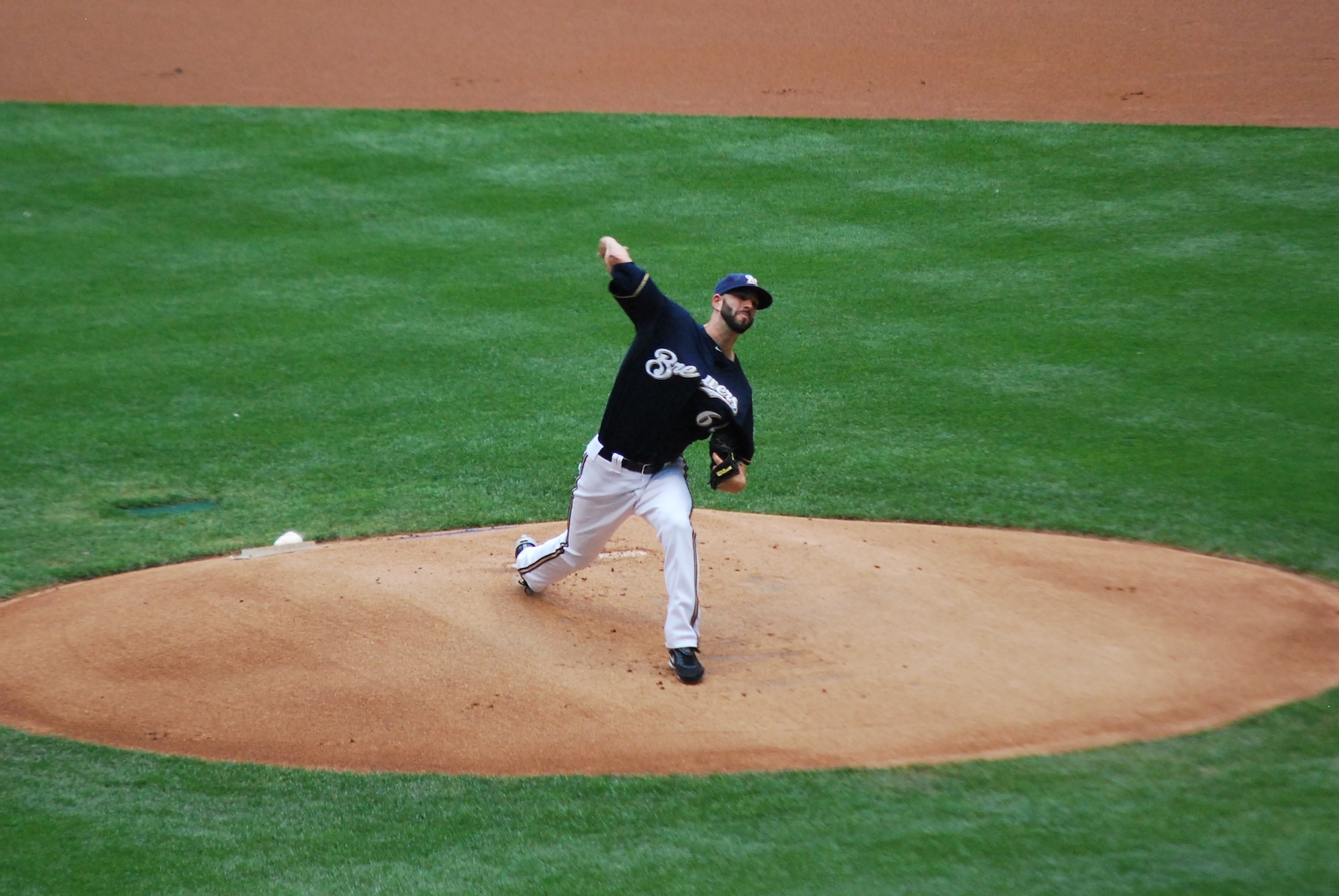 The Brewers failed to score in the first despite the one-out double from Go-Go. Marco Estrada toed the slab for the Crew and pitched well, giving up one run in six innings of work. Here he is about to release the first pitch of his outing: