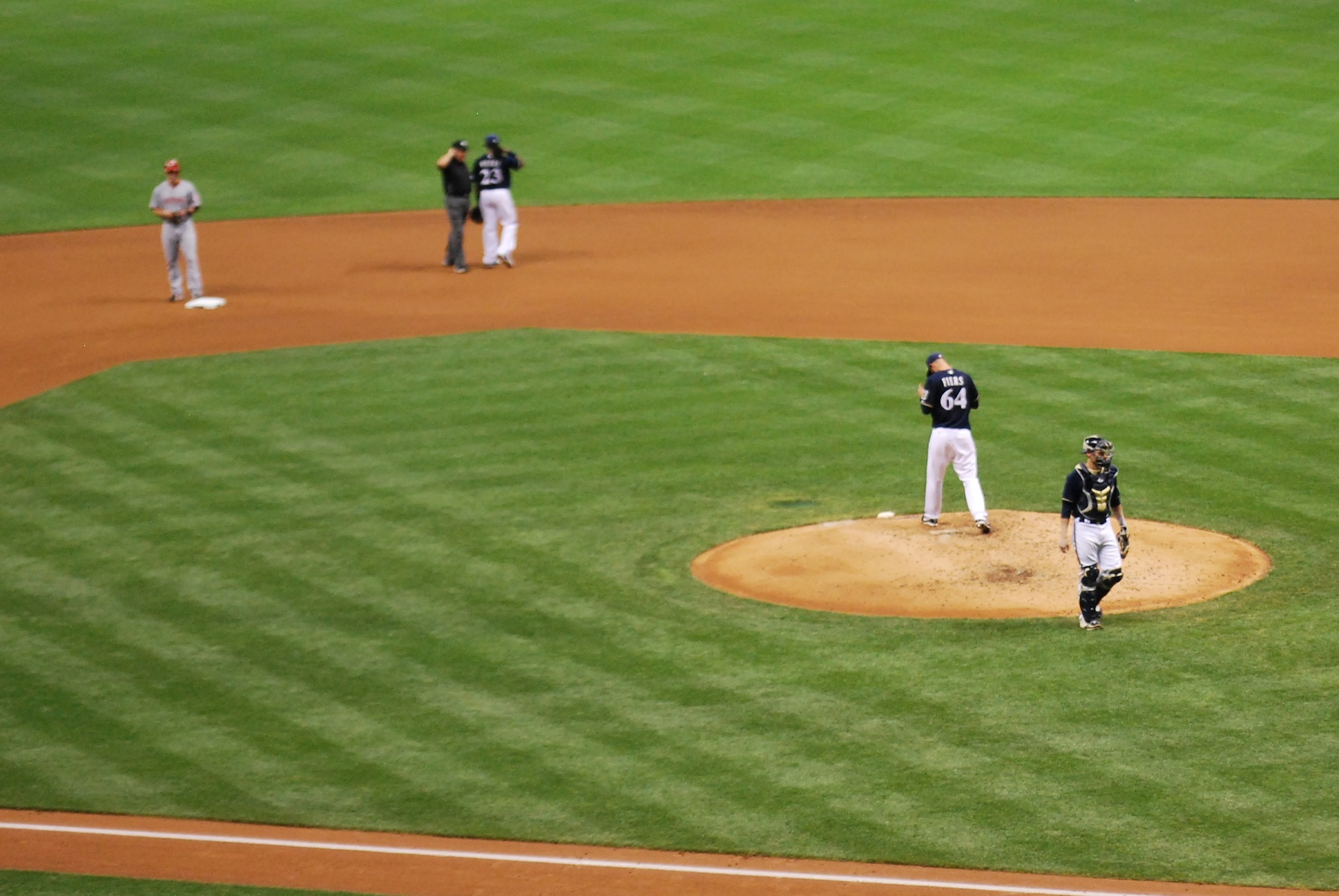 Fiers pitched into the 8th inning and the second batter of the frame, Xavier Paul, lined a 1-2 pitch foul that landed two sections to our right. It became apparent pretty quickly that everything wasn’t OK. People were standing up and waving down event staff. I saw the guy tilting his head back and applying pressure to his forehead. The ball had ricocheted off of someone else’s hands/arms and caught him above the eye. I didn’t take a picture of him, because that would be in bad taste, but I did take a picture of the paramedics that were on the scene, along with two cops. I missed the pitch right after the foul ball not because I was taking a picture but because I was curious to see if the guy was alright. Earlier in the game the same thing could’ve happened to me. Nyjer Morgan lined one back that was heading towards my shins (once I stood up and stepped into the aisle). I put my glove down but the guy three rows in front of me reached into the aisle to try and catch it. He tipped it and it flew very close to my head on its way back. The fan behind me wound up with the ball but it scares me to think what could’ve been. I trust myself to not take a ball in the face but if someone else gets a piece of a foul ball just feet from me anything can happen.
