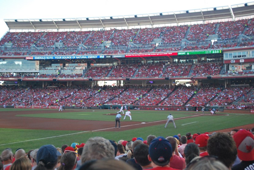 I walked around some more and got a hot dog before heading to my seat in section 112. I sat in section 112 for all three games. It’s a good section to be in but like almost every section during day games it’s in the sun for the entire game. Johnny Cueto was on the hill for the Reds and he delivered the first pitch to Aoki to start the game. The ball is just about to enter the catcher’s mitt.