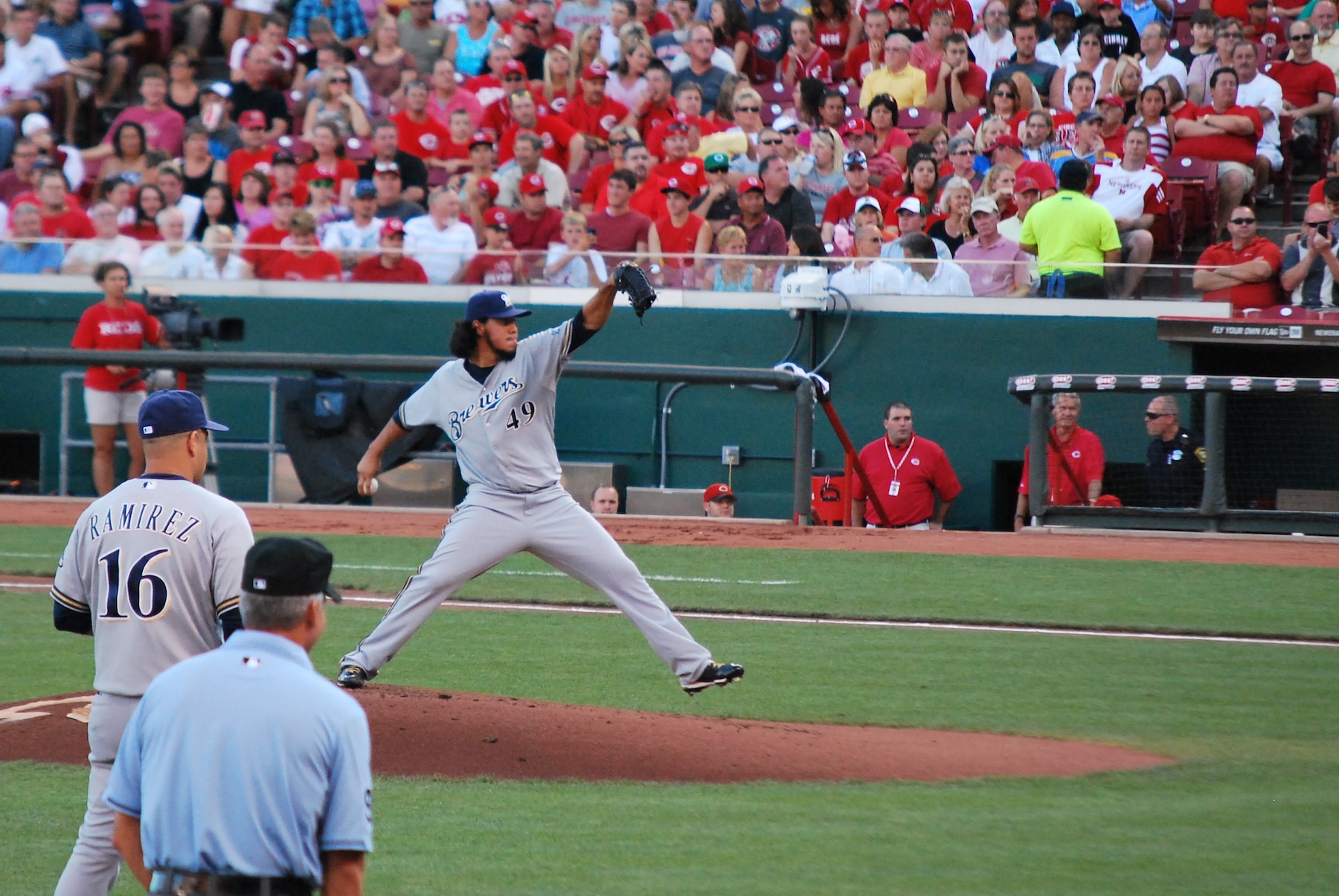 The Brewers went down in order in the first but the Reds did not follow suit in the bottom half. Gallardo was on the hill for the Brewers, coming off his last start where he struck out a career high 14 batters. Here he is delivering his first pitch to Drew Stubbs: