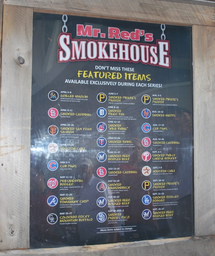 After getting the picture taken we went down to the field level and got some food from Mr. Red’s Smokehouse. They offer specials from each visiting team’s city (when they’re in town). When the Brewers are in town they have a smoked beer braised brat. You can click on the image to get a closer look (if you’re interested in seeing what they offer when various teams are in town).