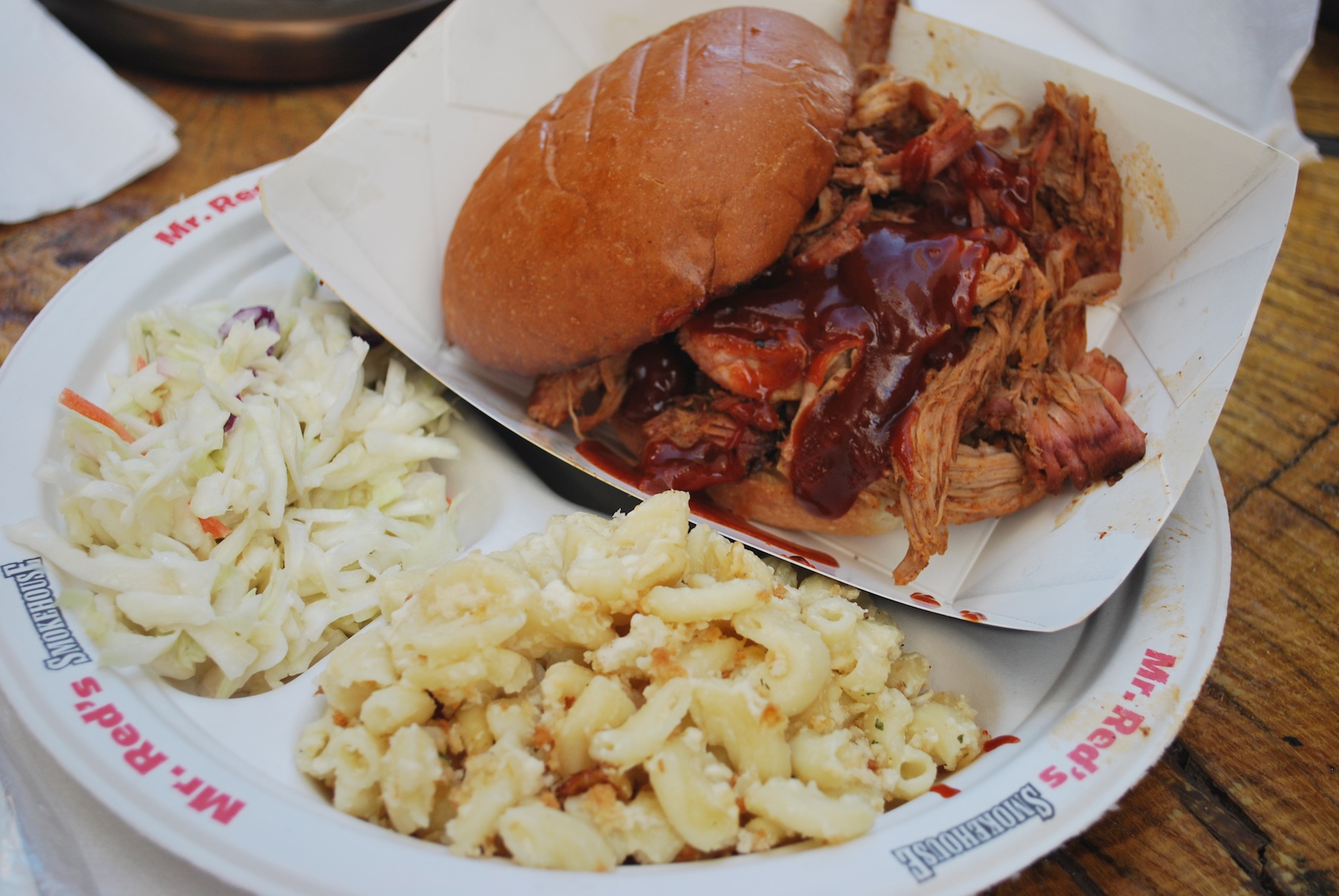 I didn’t get a brat because I can get that anytime. Instead I got the smoked pulled pork sandwich with cole slaw and mac & cheese as sides. It was delicious.