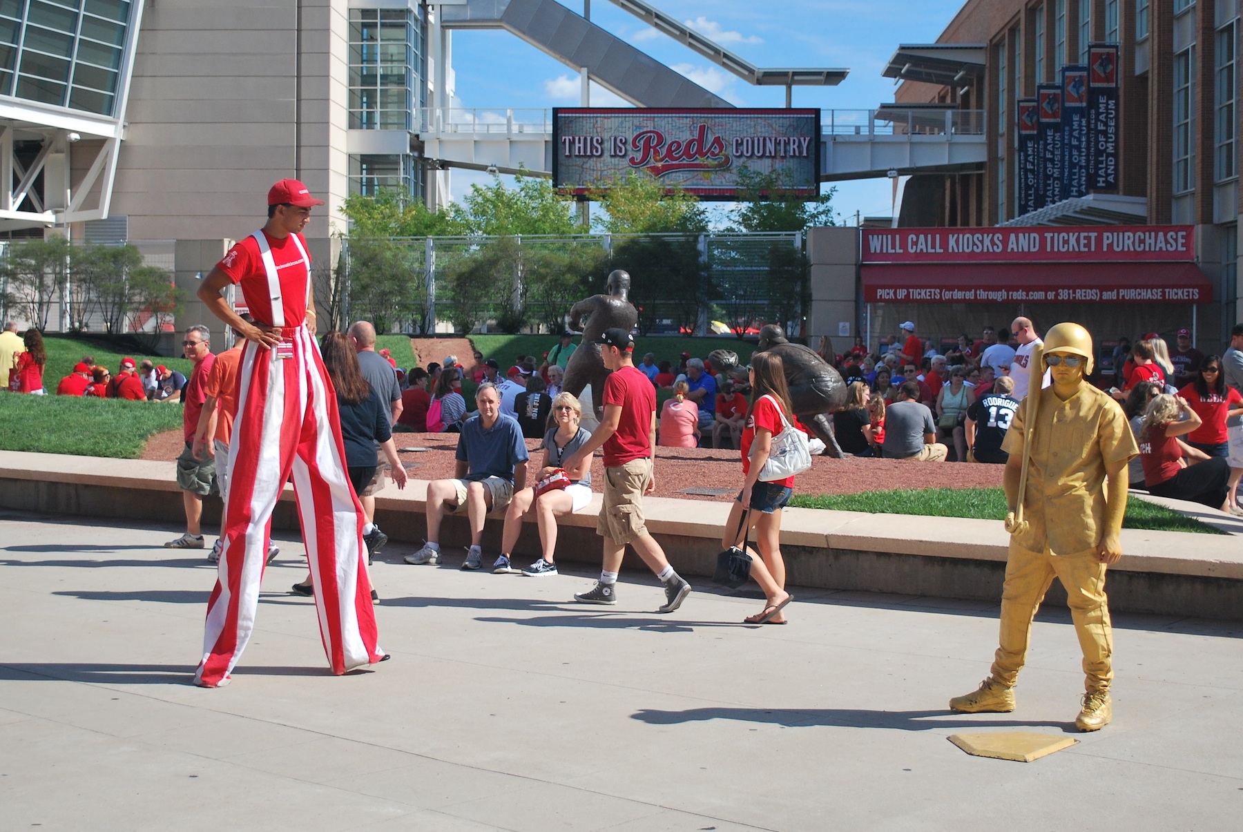 Since it’s after midnight, there’s a game in 12.5 hours, and afterwards I’m driving the 10 hours to Philadelphia; this is going to be a short post. On Saturday I finished the post for Friday, watched the British Open, and did some leg exercises to help with my knee. I went to the game with Barry again and he picked me up 4:30. We were parked at Paul Brown Stadium at 4:45 and we walked over to Great American Ballpark and tried to find a place to eat before the game. The wait was long at every place, so we just had a beer at Holy Grail Bar & Grille and then went across the street to the ballpark. While Barry was waiting in line to get the tickets I got a picture of a man on stilts and the human statue, who were outside of the stadium. I don’t know what the occasion was but there was also a guy inside the stadium that was doing magic tricks. I know that what he was really doing was slight of hand but neither Barry nor I could pick up on it. Well played magic man, well played.
