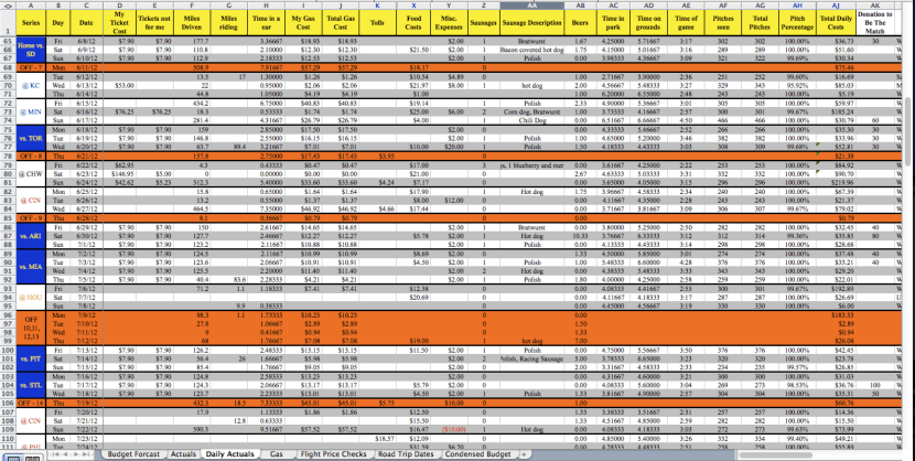 Friday I was planning on sleeping in but I woke up at 9:30, which really isn’t sleeping in since I had gone to bed at 3:00. I finished up the blog and returned some emails. I also updated my tracking spreadsheet that I use for all my statistics. People have asked about it so here it is. It’s not a perfect system, but it works for me. This is the “Daily Actuals” tab. Not pictured is an “Actuals” tab that sums things up into individual trips and then season totals.