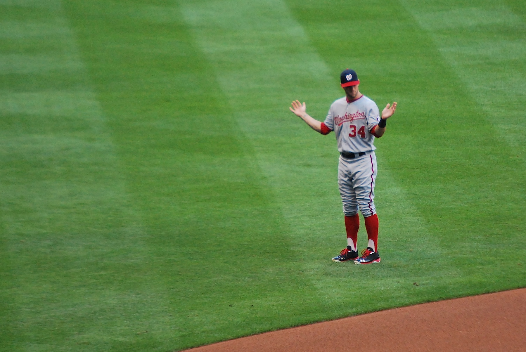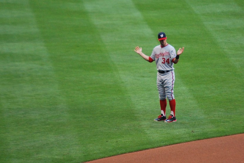 After chatting about baseball for a bit I went over to my seat and waited for my twitter follower to join me. Some of the Nationals were in shallow left field stretching and getting ready for the game. Bryce Harper is the Nationals’ 19 year old wonder kid. He’s been on everyone’s radar since his early teens, and made the cover of Sports Illustrated in 2009 at the age of 16. He’s wearing stirrups in the picture below, something that only a handful of players still wear. He also appears to be bragging about how big the fish was that got away (OK, he was actually doing the back and forth stretch for the shoulders).