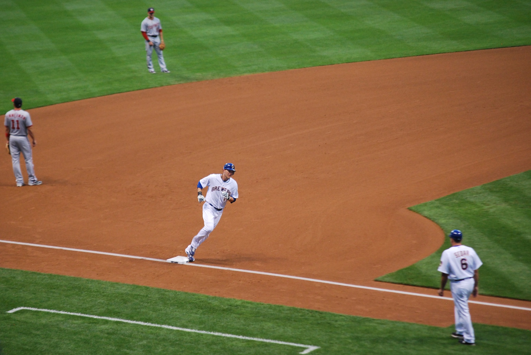 The Nationals got off to a good start and on the 5th pitch of the game Lombardozzi took Mark Rogers deep to give the Nats a 1-0 lead. It didn’t last long, however, and the Brewers answered in the bottom half. Lucroy drew a bases loaded walk and Cody Ransom drove in a run on a ground ball that glanced off the pitcher’s glove for an infield single. In the third inning Braun walked to lead off the frame. Corey Hart singled and Braun went to third. For some reason Hart had taken off for second and the Nationals third basemen threw over to get a Hart in a pickle. Braun eventually broke towards home and he scored easily while Hart was getting tagged out. Here’s Braun arriving at third as Zimmerman is about to make the throw.