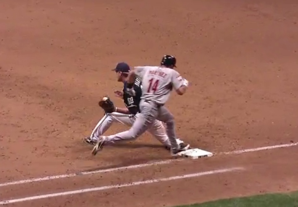 Watching it live and from my seat location I thought he was safe, and so did Astros manager Brad Mills, who ran out for the 4th time (I think) to argue a call on the field. After seeing the replay when I got home (and getting hounded on Twitter that he actually was out) I see that the right call was made. It was really close and it was a lot closer than the “half a step” like some people said. It may have reached Corey’s glove when the runner was a half step away but he really didn’t have control until *just* before Martinez’s foot hit the bag. It was a great job by the umpire, and if it weren’t for his call I might still be at Miller Park. I paused the video when I believe Hart had control of the ball and took a screen shot. If you watch the clip you’ll notice that the ball entered his glove before this point but my screen shot below is when I think he had control of the ball, giving him the opportunity to record an out. They slow it down at the 50 second mark if you don’t feel like watching the first part of the replay.