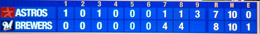 In the top of the 8th the Astros wasted no time tying it up, and the third batter doubled to drive in Altuve. In the bottom of the 8th the Brewers had runners at the corners and nobody out when Izturis stepped to the plate. He swung away and dribbled one fair that rolled down the first base line. It basically turned into a squeeze play and Lucroy scored easily. On top of that there was no play on Izturis at first, it was a perfectly executed swinging-bunt squeeze play that he couldn’t have done any better if he had been trying to.