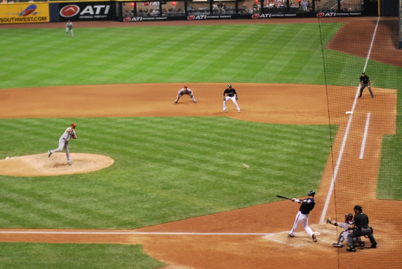 It is now 1:53 AM, so I’ll be brief with the game. The Brewers took a 1-0 lead in the top of the first but the Phillies answered and tied it in the bottom half. The game remained 1-1 into the 6th, when Ryan Braun led off the frame. He sent a missile to centerfield that ricocheted off the batters eye. According to hittrackeronline it only reached 68 feet at it’s peak, and that seems about right. I got a picture of him just after making contact. The ball is a blur about a finger’s width from his bat.