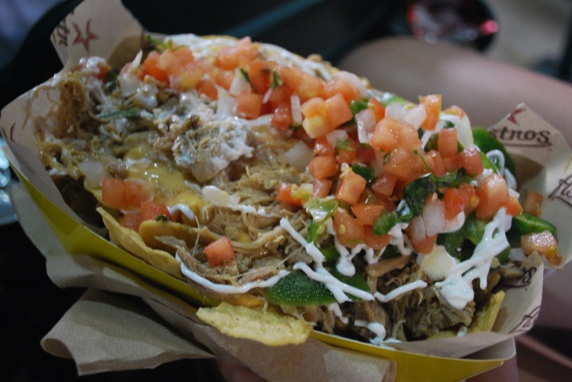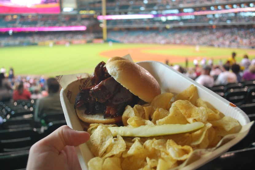 Sidebar time. Annie, a girl that I went to high school with, now lives in Houston (which I didn’t know before yesterday) and we met up in the 5th inning. We saw someone in front of us get some chicken nachos and even though I had already had a Nacho supreme earlier in the game I agreed that if Annie got some I would share. They were quite delicious but the raw jalepeños were a little much. I had slices with a few bites but it was too hot, even for me.