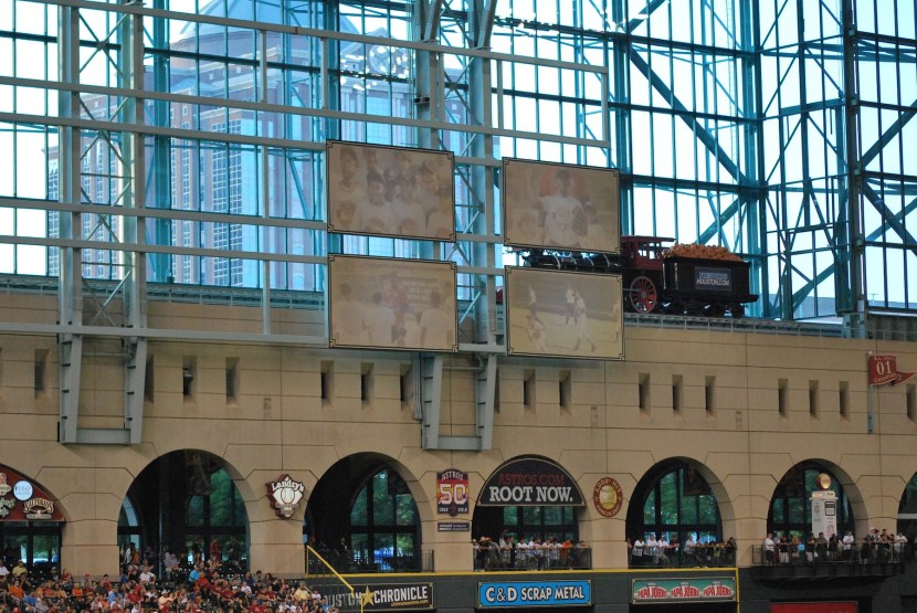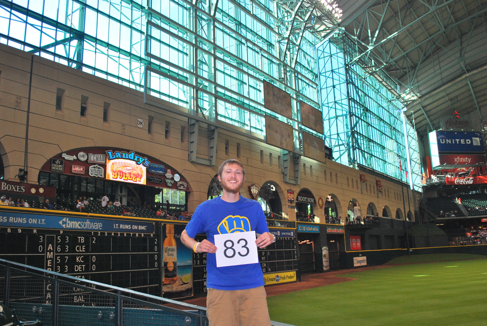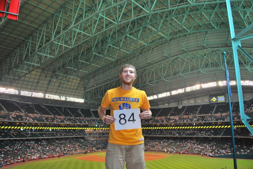 I was able to check in early again and I answered some emails and took an hour long nap before getting ready for the game. I got to Minute Maid Park at 5:45 but had to wait until six to get my ticket. Sometimes the Brewers’ provided tickets are available more than an hour before, and sometimes they’re not. An hour before the game is plenty of time, though, and I got inside at 6:05. I said hi to Tim Dillard as he ran in from shagging balls during batting practice, then went to get game photo number 83 taken. I decided on the Crawford Boxes as the backdrop and had a nearby fan with his own DSLR take the picture with my camera.