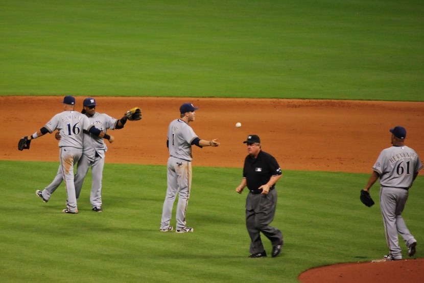 Livan Hernandez pitched the 8th and the 9th and didn’t give up a run. Final Score: Brewers 7 – Astros 1. The final batter grounded out to Rickie Weeks, so Corey Hart had the final-out ball. He flipped it to Hernandez as Rickie and Ram-Ram hugged it out.