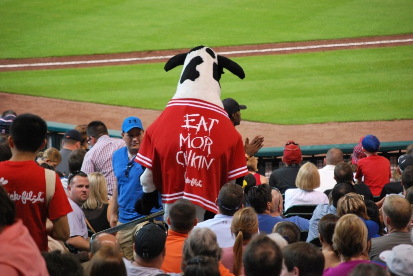 At one point the Chick-Fil-A mascot came down the aisle closest to us and was throwing out t-shirts. We were made aware of the cow’s visit beforehand because a cute little girl a few rows in front of us was facing the concourse, pointing, and saying “cow”.