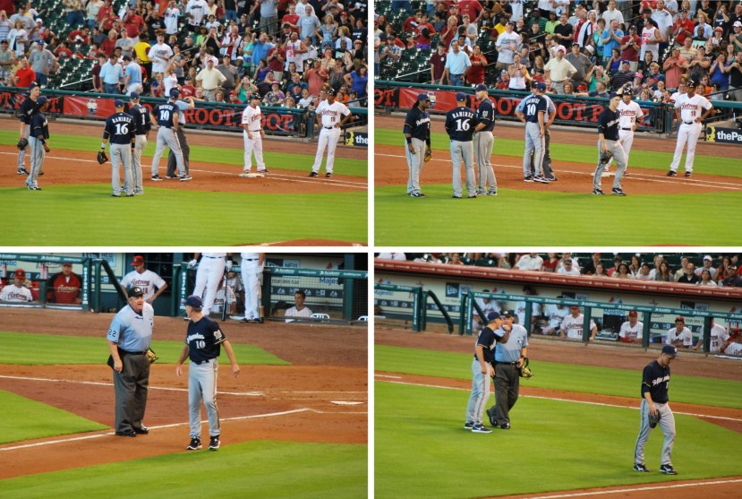 Annie, who met up with me on Friday, joined me for the game and we sat in section 110. The Brewers stranded two in the first, and then the game took a crazy turn. Greinke gave up a “triple” on the first pitch he threw. I put triple in parentheses because Gomez dove for it and it got past him. If he just played it on a hop it would’ve been a single. Altuve was the next batter and on the fourth pitch of the game he grounded one that Hart had to range far to his right to get. Greinke was a little late covering the bag and Altuve was called safe. Greinke turned towards second base and spiked the baseball (away from the umpire). First base umpire Sam Holbrook ejected Greinke and he pleaded his case. Replays show him saying “I’m mad at myself”, which makes sense because he probably could’ve gotten there quicker. I didn’t have my camera out when he spiked the ball so I didn’t get a picture of that but I got some pictures of Roenicke arguing. Going clockwise from top left: