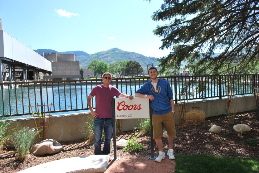 We only got two of the three samples they offer, hit up the gift shop, and then it was time for lunch. On our way to the shuttle pick-up we had someone get a picture of Dustin and me. You might notice that faint “M” above Dustin’s left shoulder, up towards the peak. If you click the picture you can get a bigger image. The M is for the nearby Colorado School of Mines. The water behind us is a cooling pond, and it also provides Coors with a little bit of electricity.