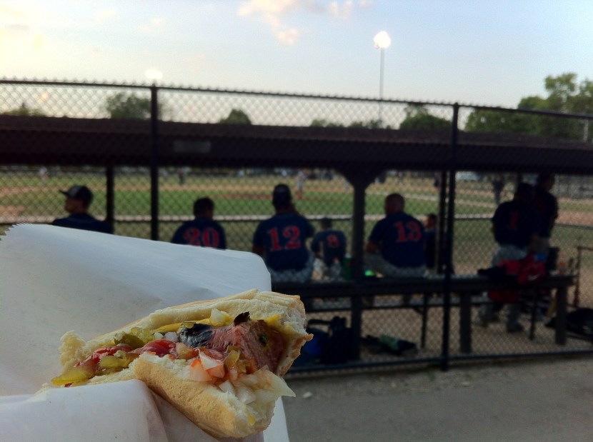 On Thursday I had another physical therapy appointment and then headed back to Fort Atkinson. My friend Dustin, who came on the Phoenix – Los Angeles trip with me, was in town and we hung out. The Fort Generals (a home talent league baseball team) had a game at Jones Park. It’s arguably the best non-professional baseball park in the State. I might be biased in that but I believe Sports Illustrated did a piece on it a few years back. I’m not sure what year (it was probably the 1920’s) but the Green Bay Packers played an exhibition game at the park. Good stuff. $1 hot dogs and $1 beers are always on the menu, so if you’re ever in Fort Atkinson I suggest you make a visit. Jones Park is on Janesville Avenue, just south of downtown. This was the hot dog I got, and you can see my friend (number 12) in the background. His name is Josh and he plays shortstop and pitches for the Generals. He’s come to a few home games this year with me as well.